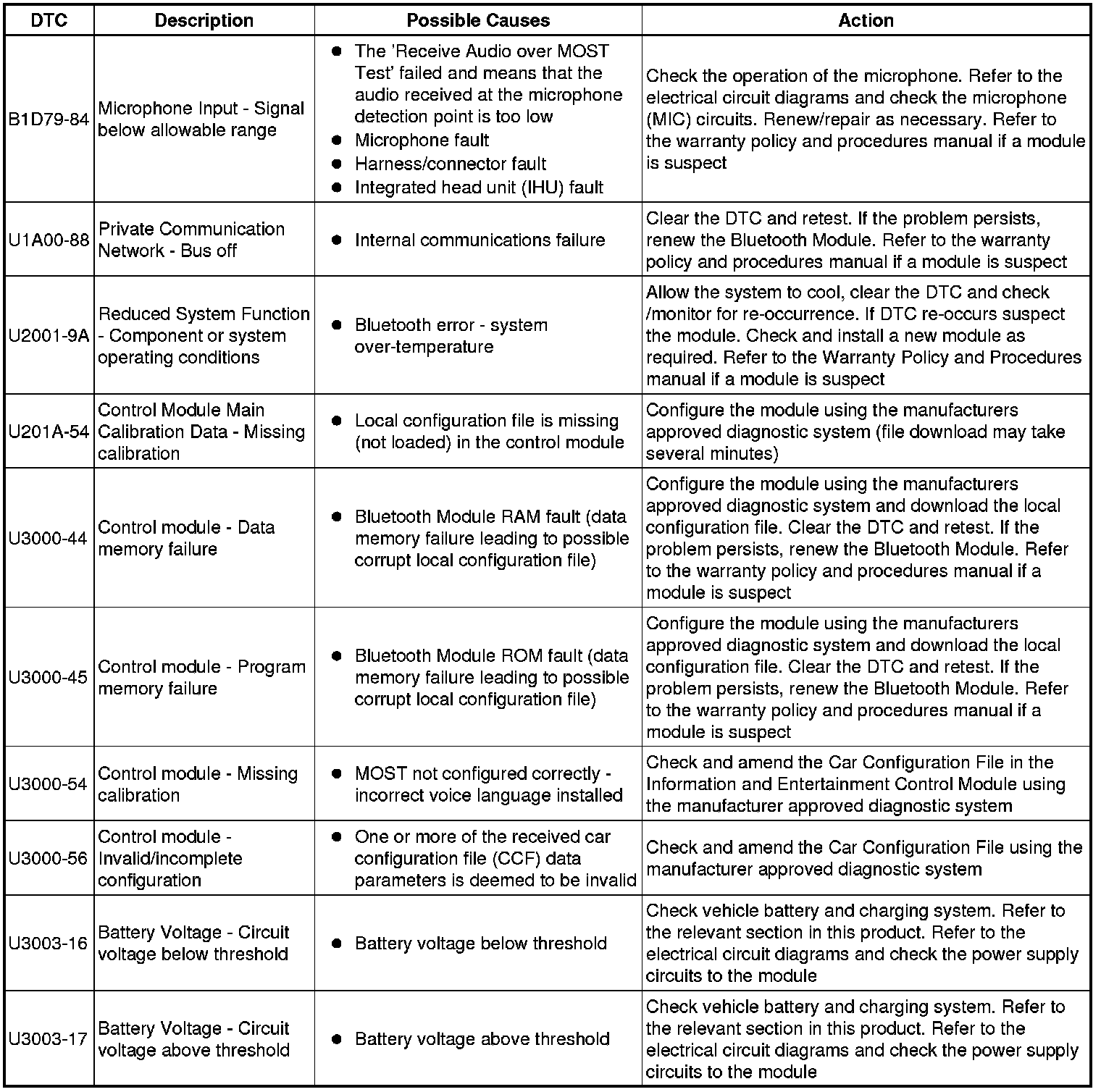 The table below lists all Diagnostic Trouble Codes (DTCs) that could be logged in the Telephone Control Module, for additional Diagnosis and Testing information refer to the relevant Diagnosis and Testing Section. For additional information, refer to Cellular Phone Testing and Inspection
