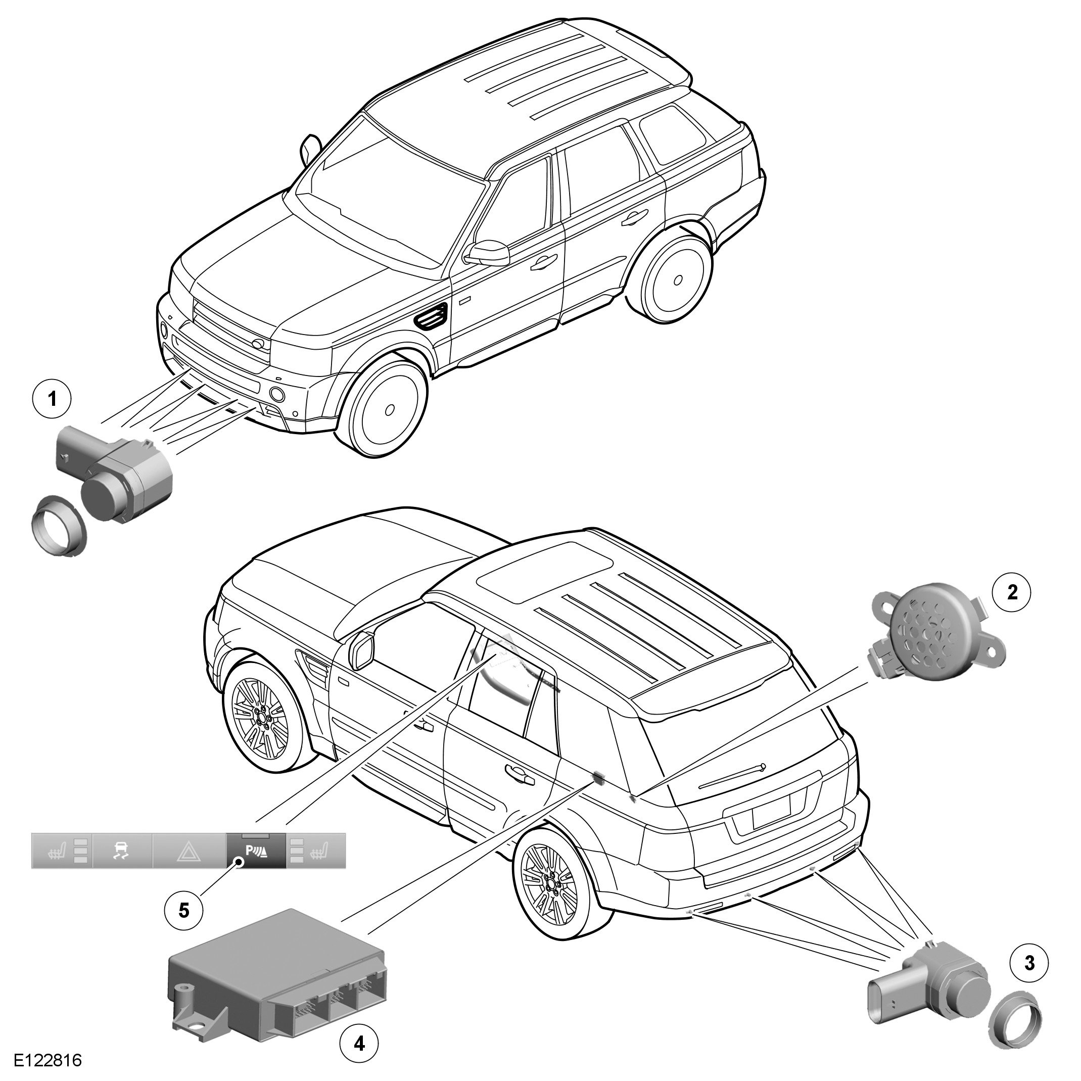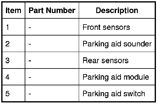 The system comprises 4 ultrasonic sensors in the rear bumper, 4 ultrasonic sensors in the front bumper (if fitted), a control module, a fascia mounted control switch, a rear sounder unit and a front sounder unit (integral with the instrument cluster).