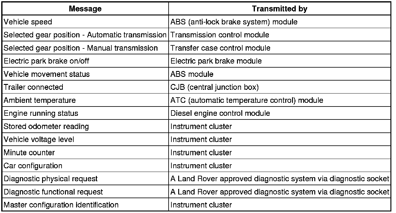 The parking aid module receives the messages shown in the following table which are used to control the parking aid system.