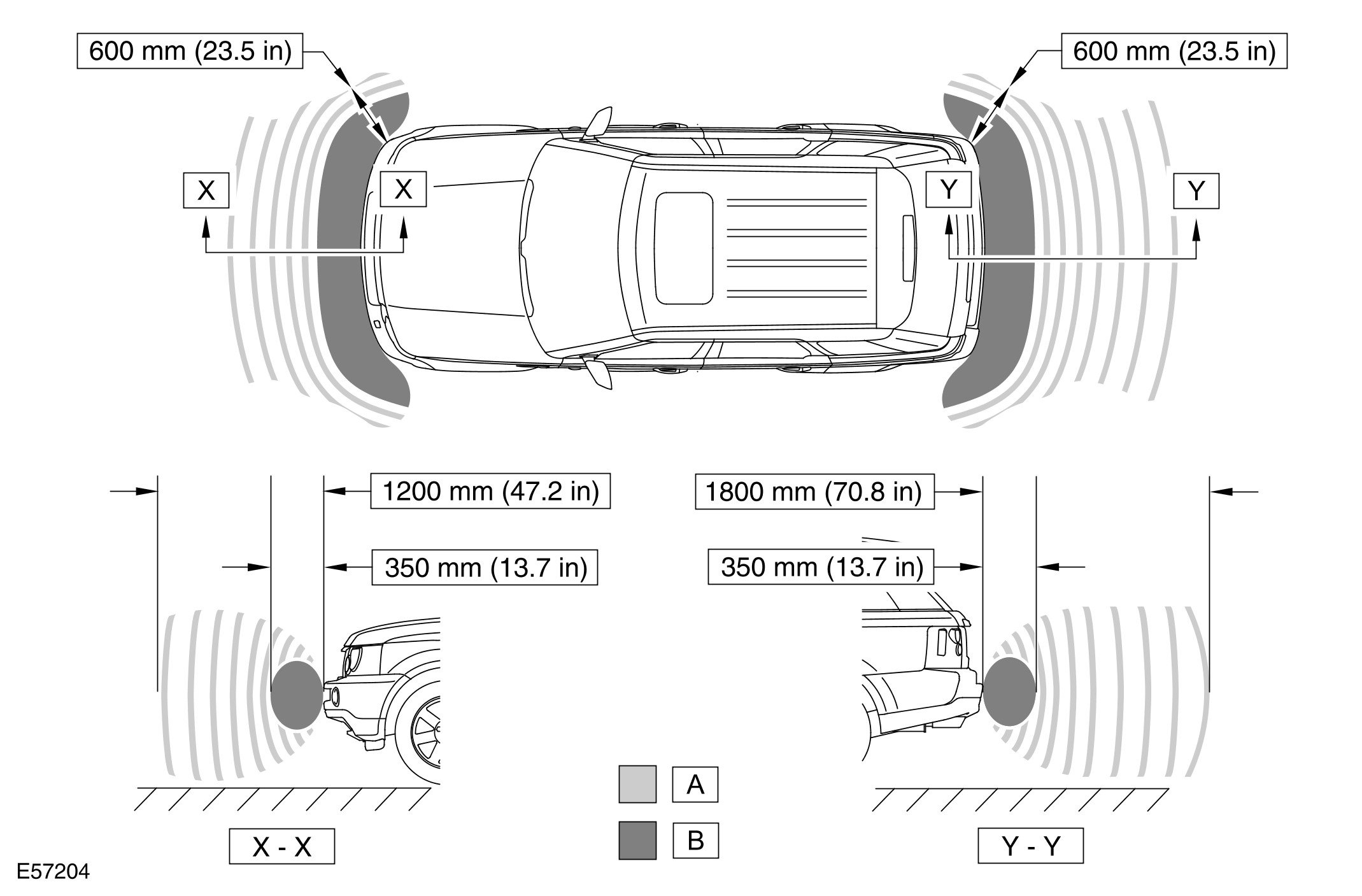 The maximum detection range is 1800 mm (70 in). When an object is detected, the time delay between the audible warning tones decreases as the distance between the detected object and the vehicle decreases until, at approximately 350 mm (13.7 in), the audible warning tone is continuous.