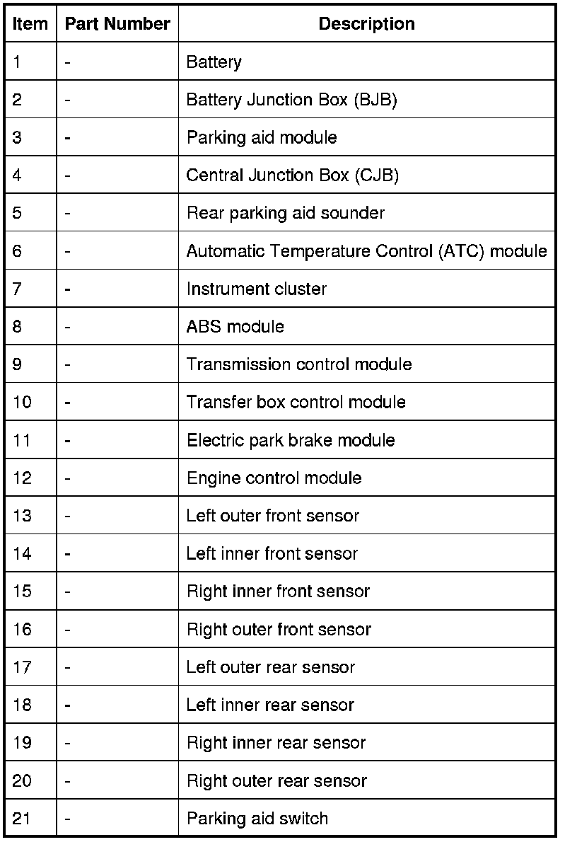 The parking aid module receives a signal on the CAN from the CJB when a trailer is fitted. When this signal is detected, the parking aid module suspends operation of the rear parking aid sensors.