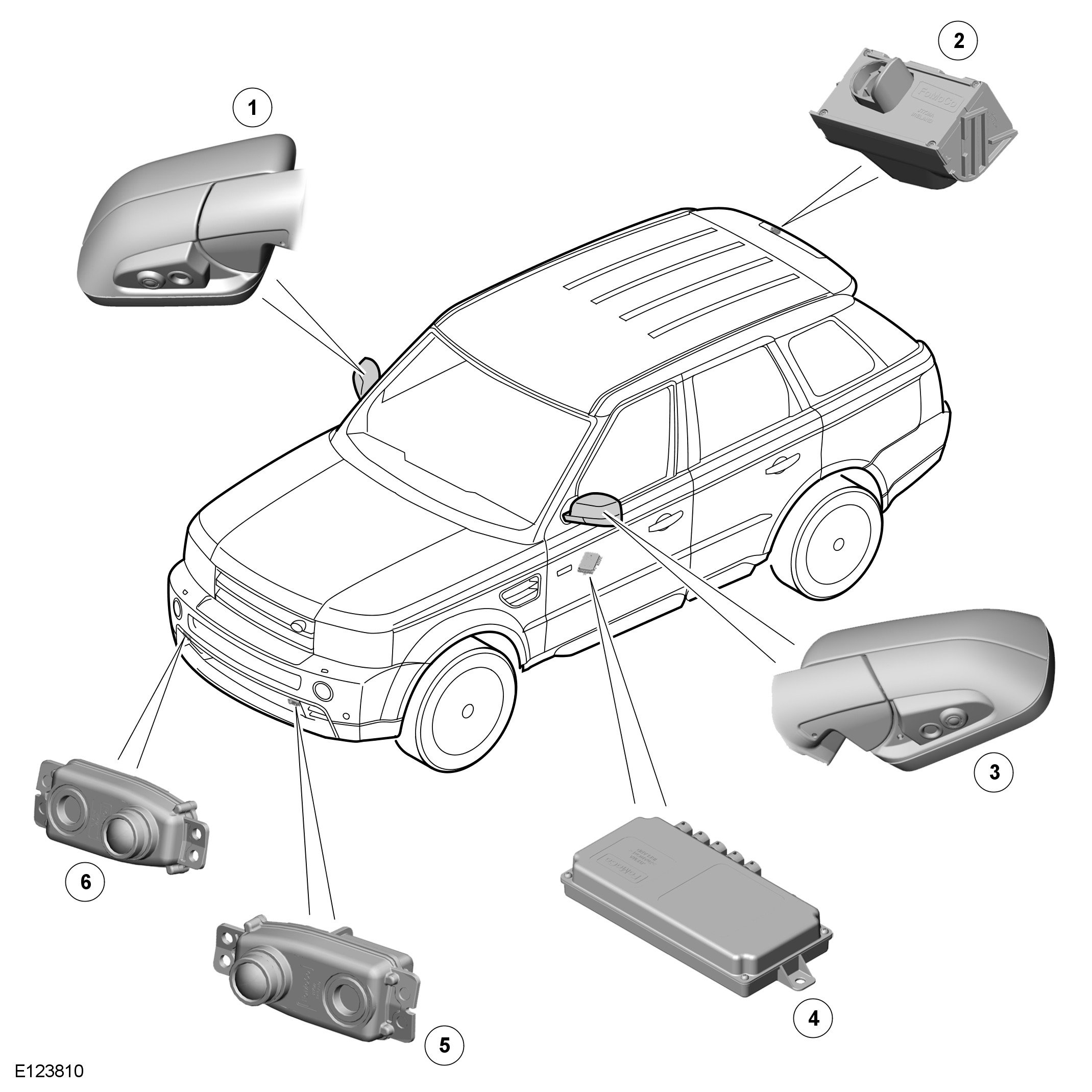 The proximity camera system provides the driver with a visual-aid when maneuvering the vehicle at low speeds. The system uses a dedicated control module to capture the camera data and display the resulting images on the TSD (Touch Screen Display), providing the driver with a 360° view around the vehicle. The camera system is also supported by various driving-aid features where graphical information and warnings are superimposed onto the images displayed on the TSD.