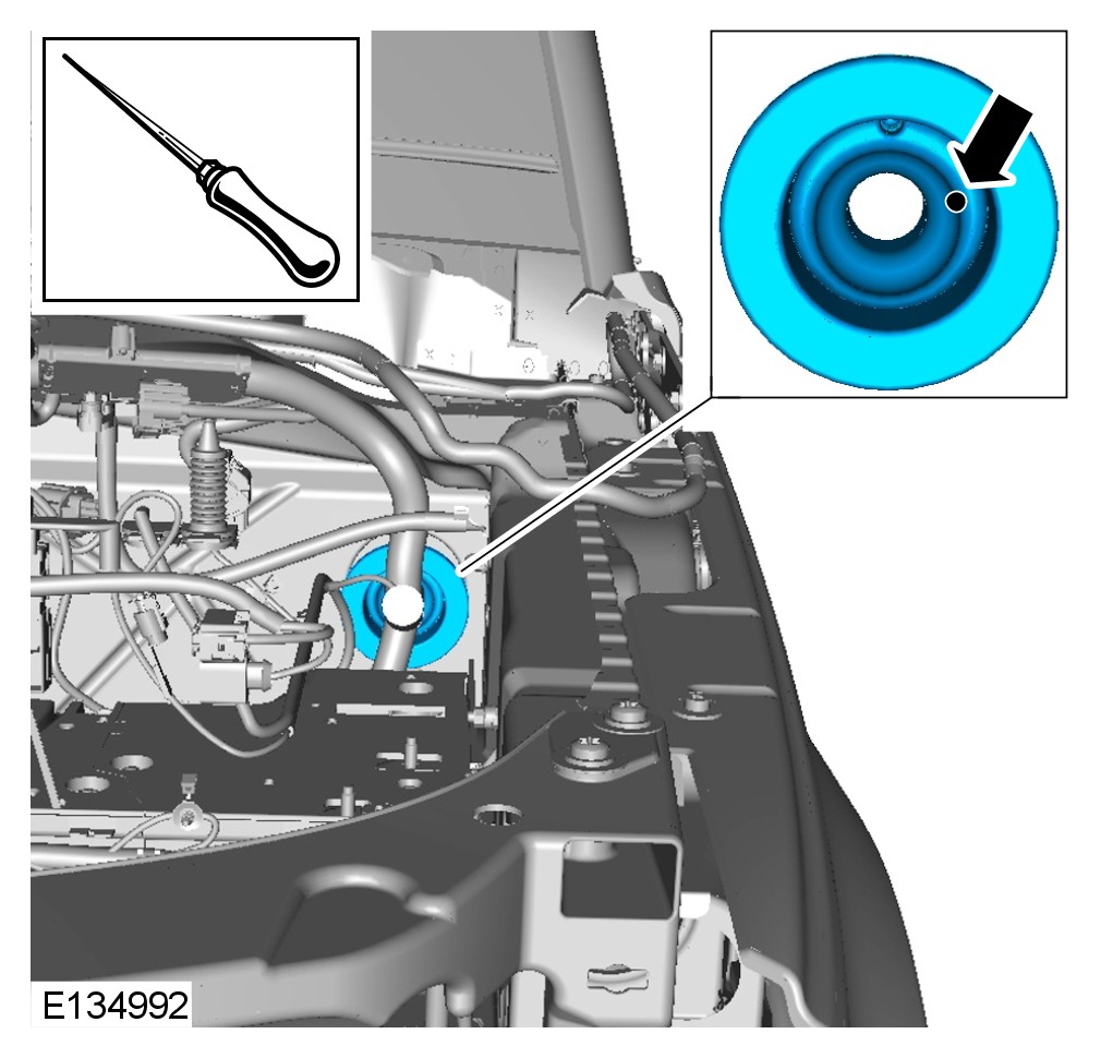 7 Using a suitable tool, make a hole in grommet in the position shown.