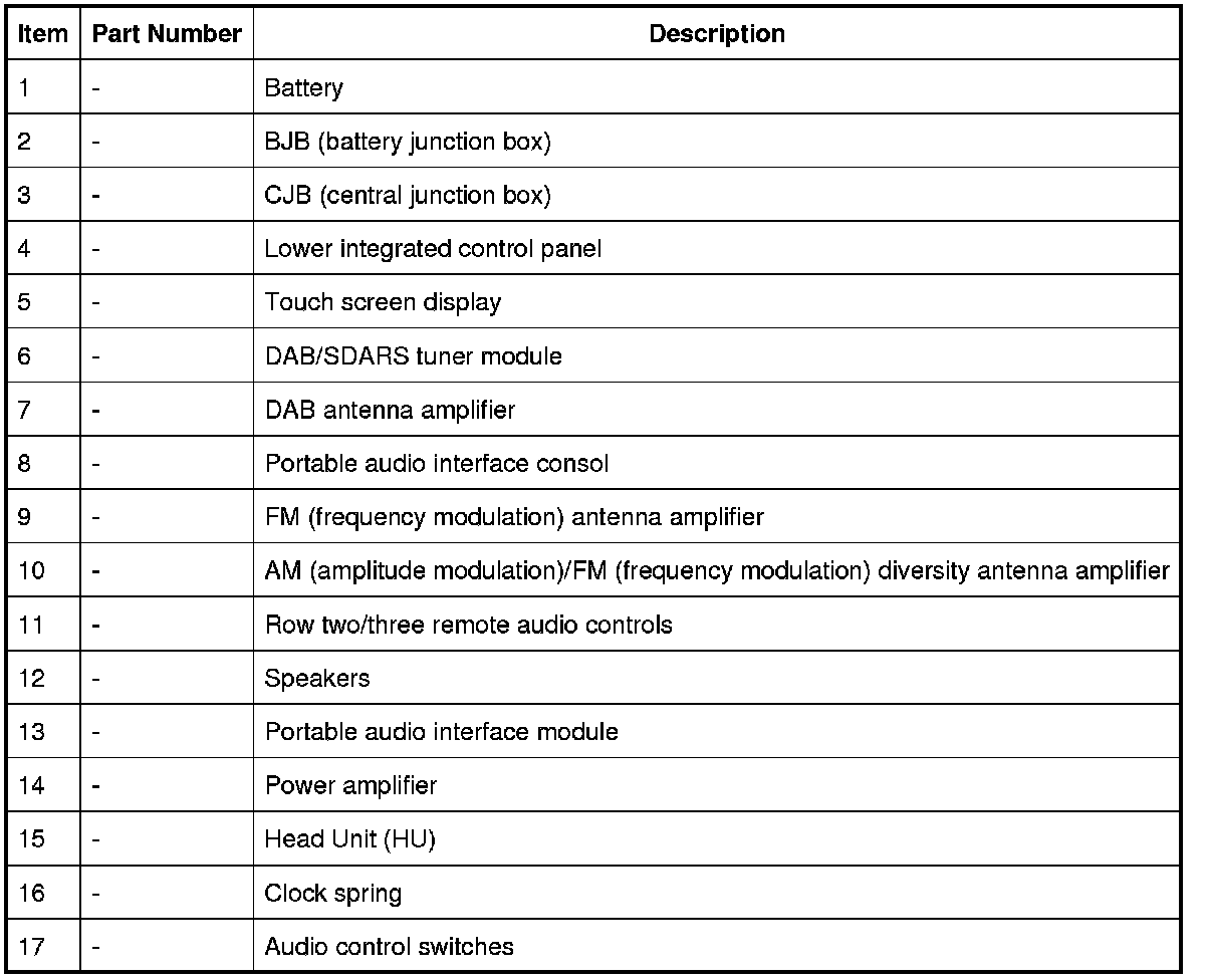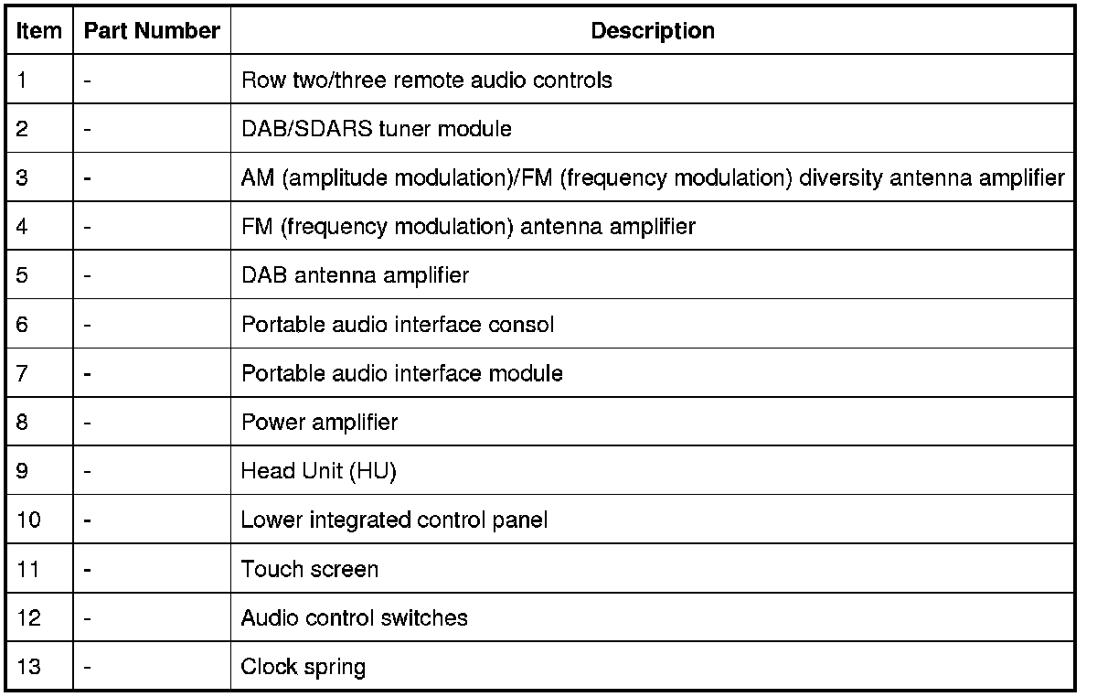 The audio system is based around a head unit which communicates on the Media Orientated System Transport (MOST) ring and the medium speed CAN (controller area network) bus.