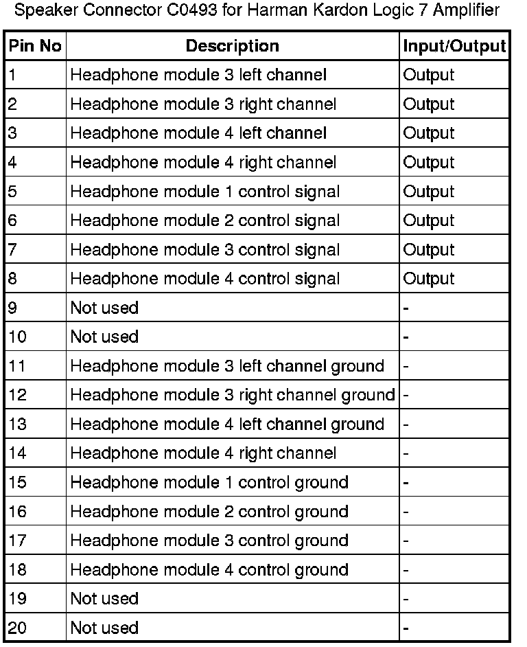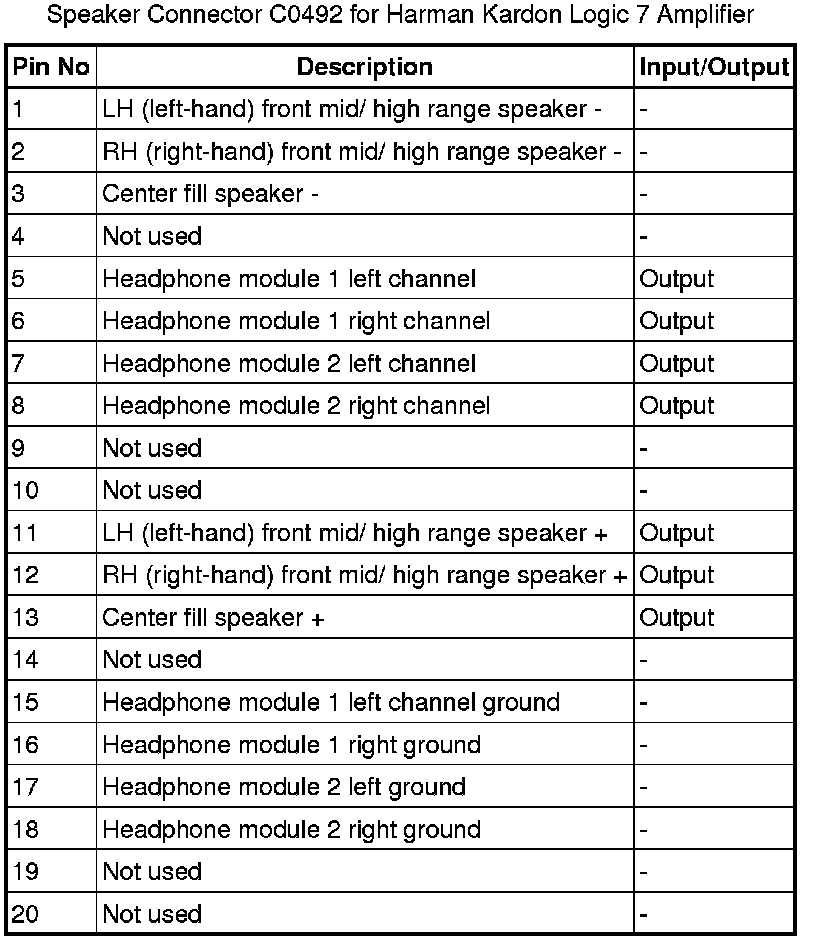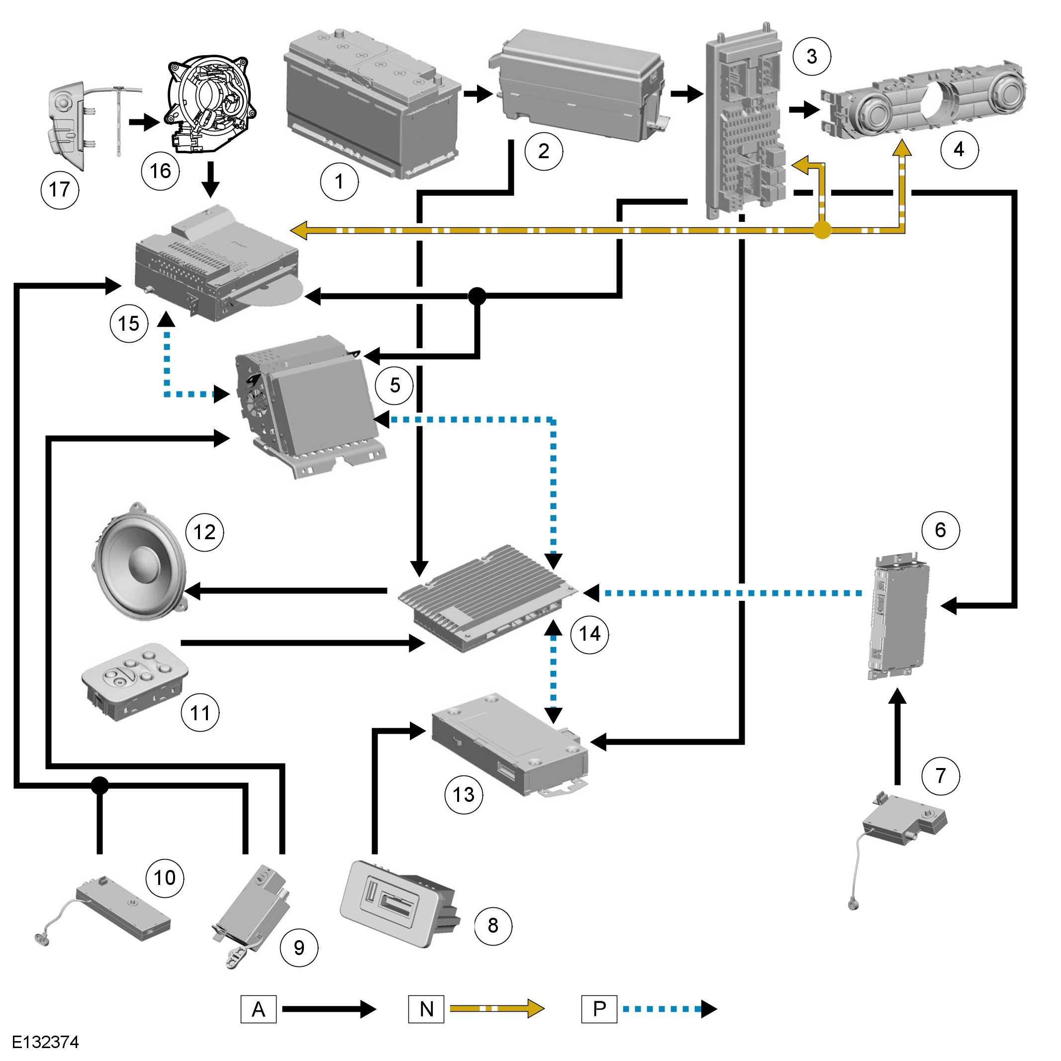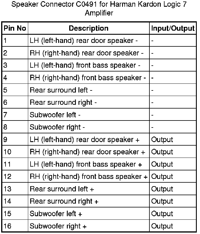 The amplifier is located under the RH (right-hand) front seat and is connected to the audio system via the MOST bus. Speaker connections are hardwired.
