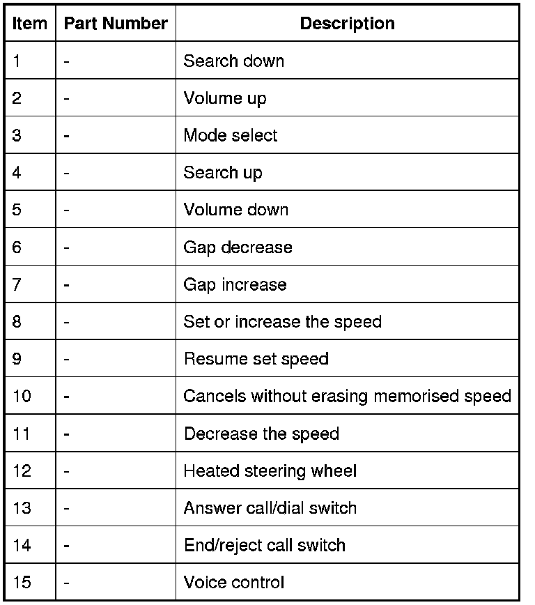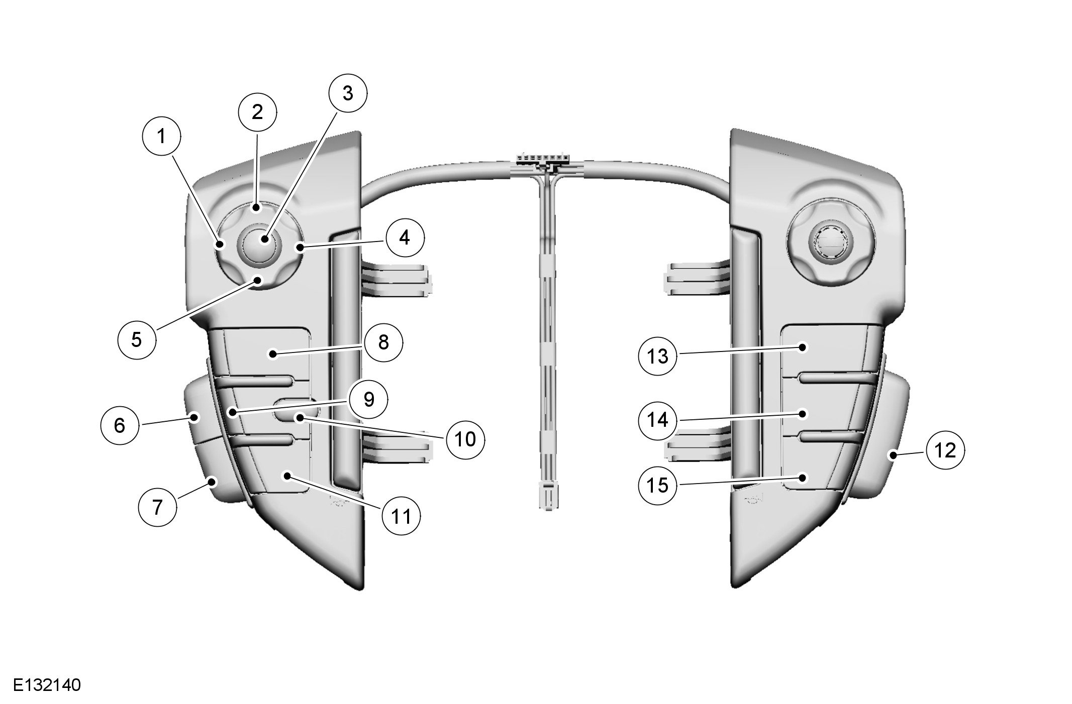 The HU can be remotely controlled via steering wheel mounted controls. The audio steering wheel controls are mounted to the RH (right-hand) side of the steering wheel with the voice recognition system control (push to talk switch) located on the LH (left-hand) side of the steering wheel behind the speed control switches.