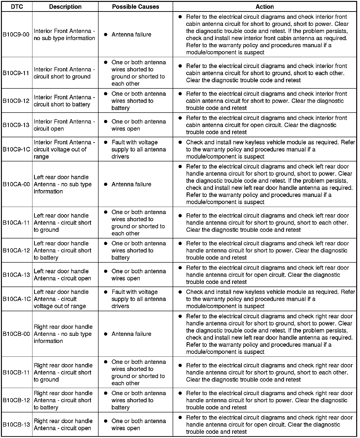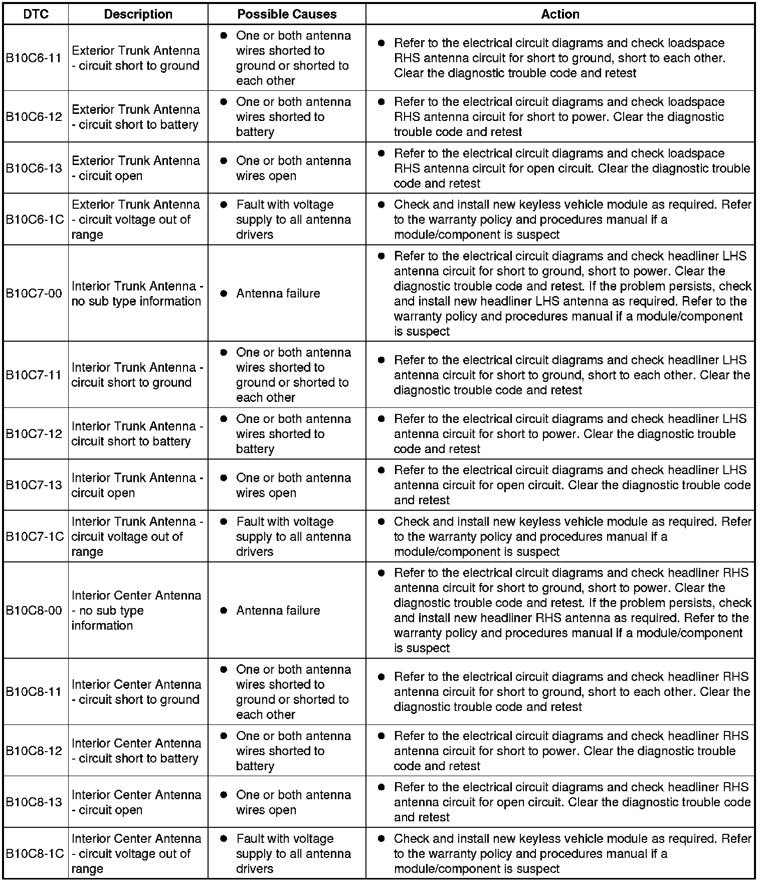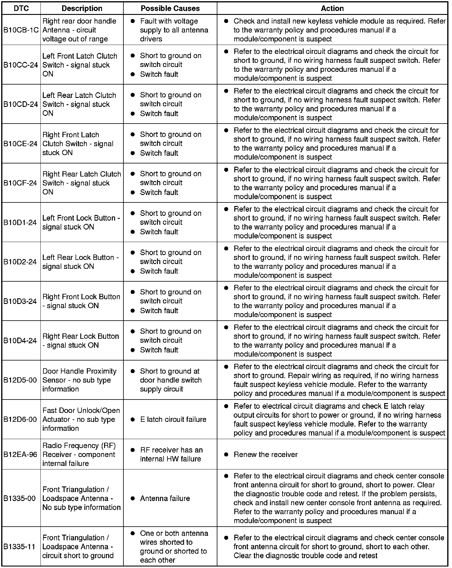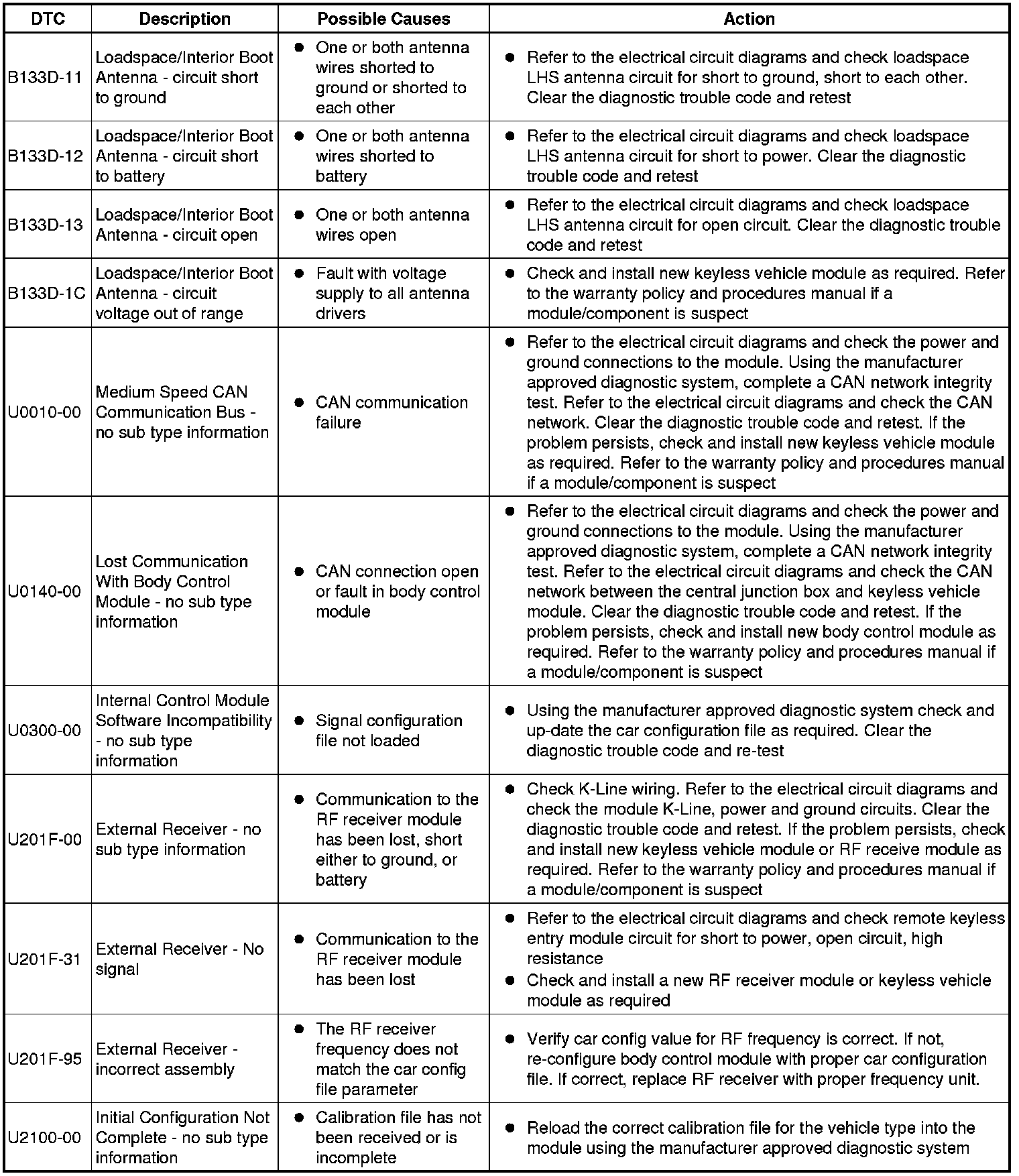 The table below lists all Diagnostic Trouble Codes (DTCs) that could be logged in the Remote Function Actuation Module, for additional Diagnosis and Testing information refer to the relevant Diagnosis and Testing Section.For additional information, refer to Locks, Latches and Entry Systems Initial Inspection and Diagnostic Overview