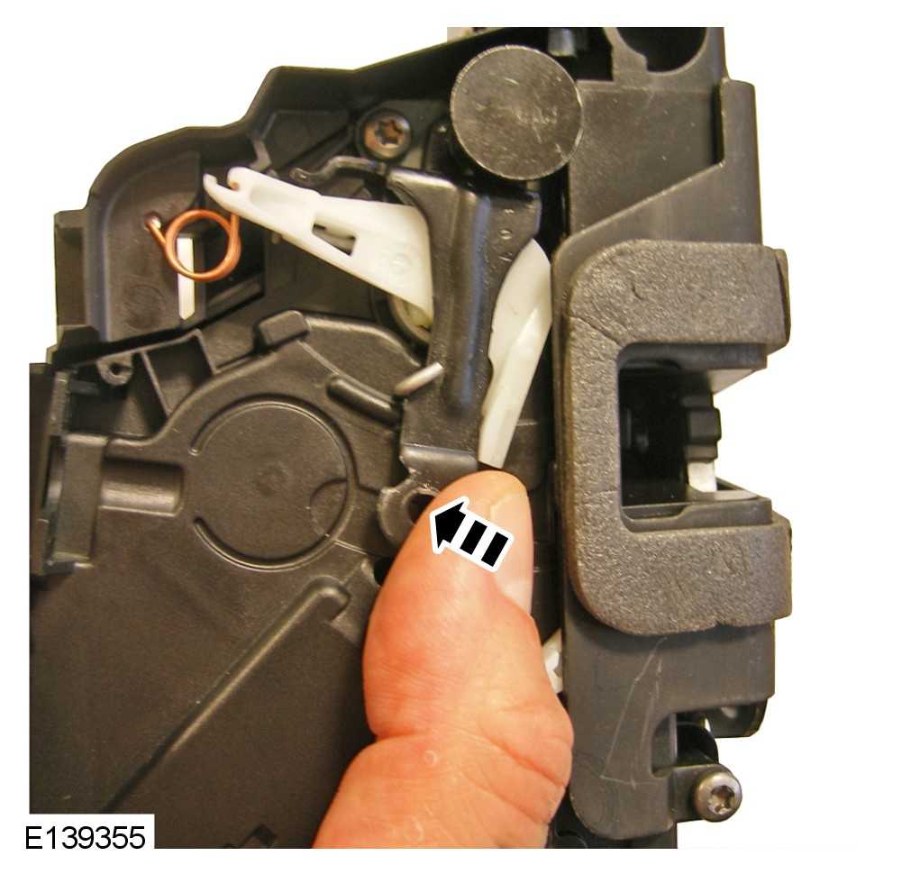 Whilst the latch is still in its unlocked state, push the latch interior release lever against its return spring, whilst simultaneously applying a light pressure to release the latch claw using a small screw driver or similar