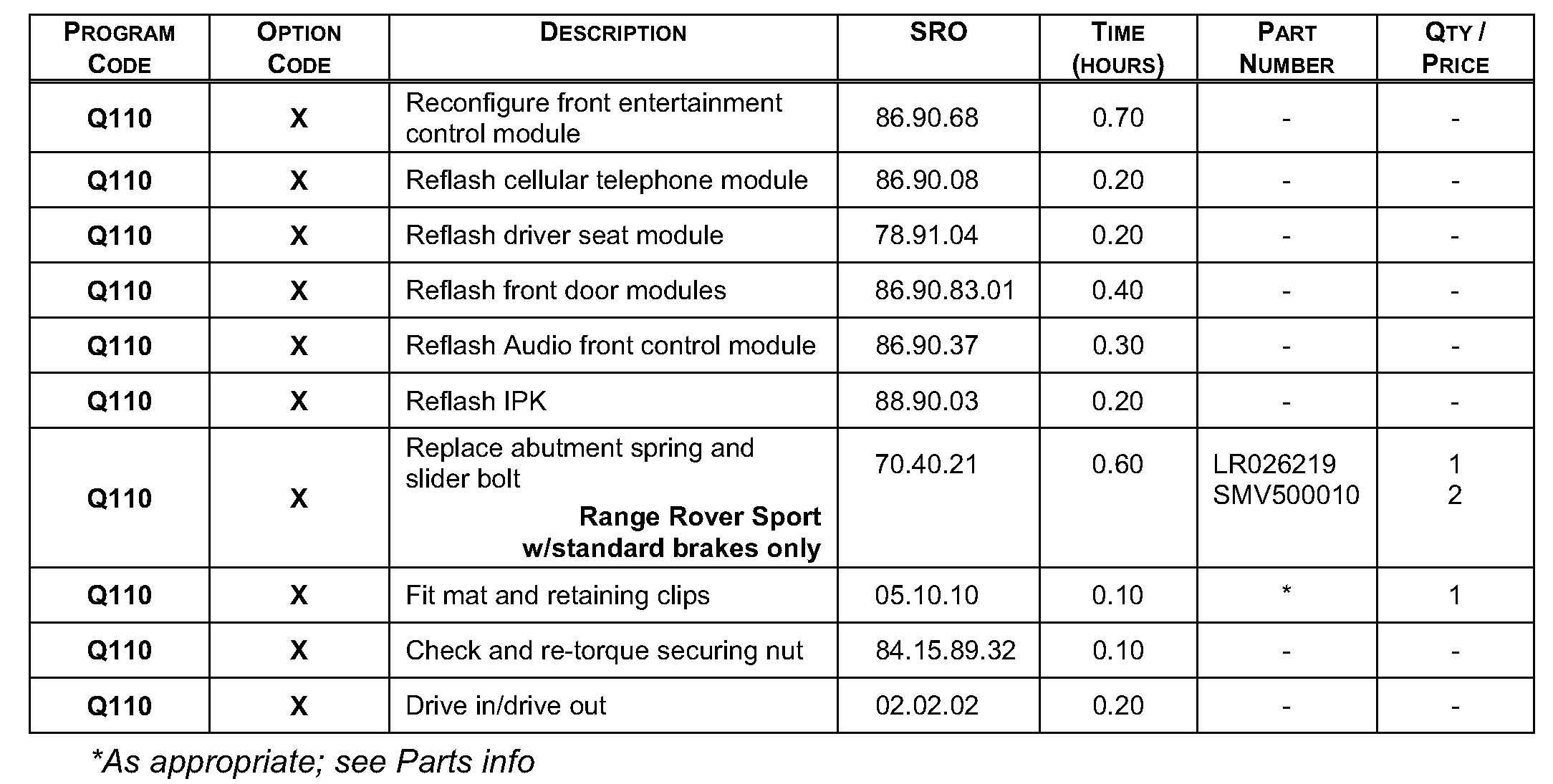 Warranty claims should be submitted quoting Program Code Q110, Option Code X, and the relevant SRO. The drive in / drive out SRO (02.02.02) may only be claimed if the vehicle is brought back into the workshop for this action alone to be undertaken.