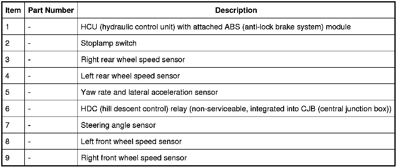 The HDC relay is a non-serviceable, solid state relay on the circuit board of the CJB (central junction box). Operation of the HDC relay is controlled by the ABS module switching the coil to ground.