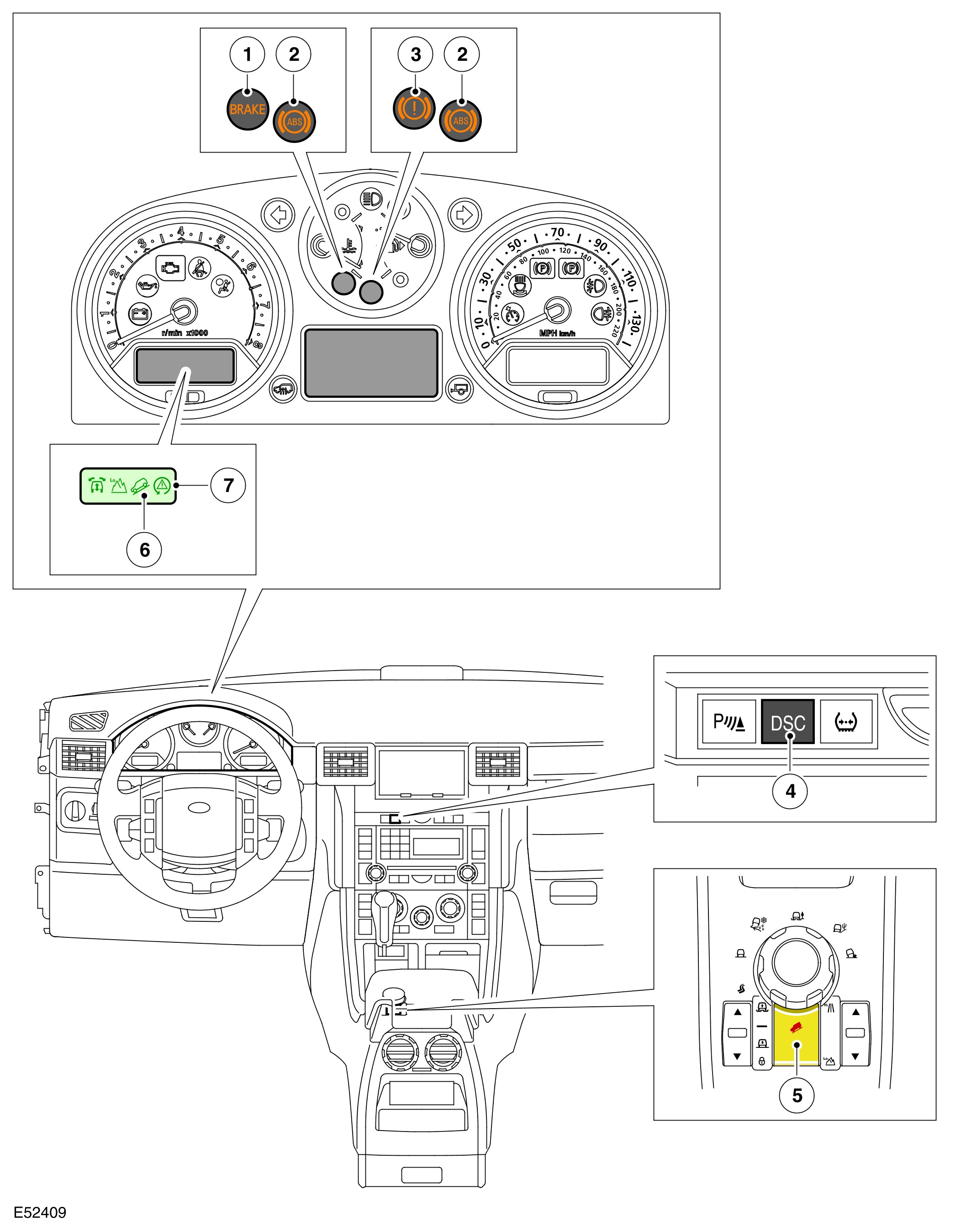 The status of the DSC switch selection is shown by the DSC warning indicator. The DSC warning indicator is off while DSC is selected on, and continuously illuminated while DSC is selected off.