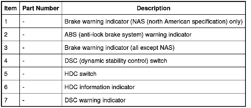 The ABS (anti-lock brake system) module monitors the yaw rate and lateral acceleration sensor for faults. If a fault is detected the ABS (anti-lock brake system) module stores a related fault code and illuminates the DSC warning indicator. Also, a warning chime sounds and a message advising of an HDC fault is shown in the message center. For additional information, refer to Instrument Cluster