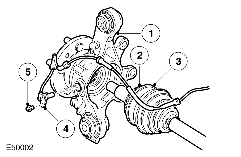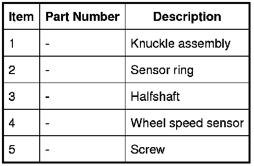 An active wheel speed sensor is installed in each wheel hub to provide the ABS (anti-lock brake system) module with a rotational speed signal from each road wheel. The head of each wheel speed sensor is positioned close to a 48 tooth sensor ring on the outer diameter of the constant velocity joint of the halfshaft. A flying lead connects each sensor to the vehicle wiring.