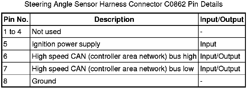 The steering angle sensor measures the steering wheel angle and the rate of change of the steering wheel angle (known as the steering wheel angle speed). These measurements are output on the high speed CAN (controller area network) bus, together with a quality factor signal, for use by other systems. The ABS (anti-lock brake system) module uses the steering angle sensor signals for CBC and DSC operation.