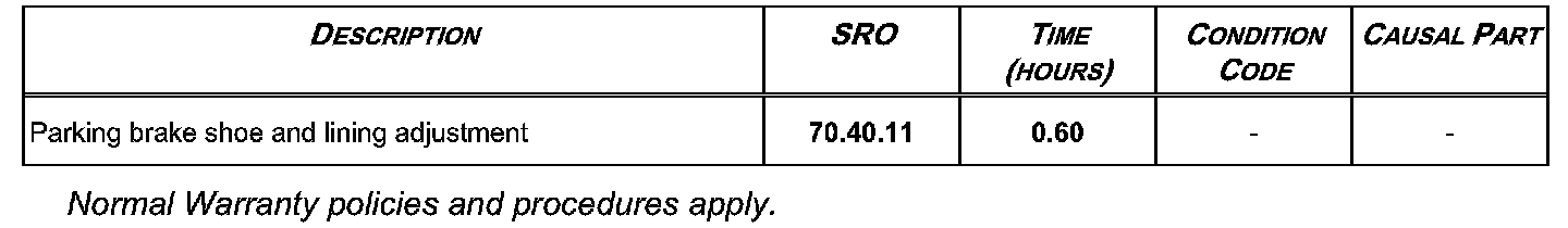 Adjustment of the park brake shoes when carrying out a routine service schedule is not typically claimable through Warranty.