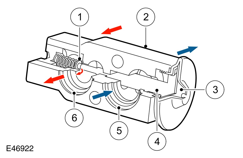 To protect the refrigerant system from unacceptably high pressure, a pressure relief valve is installed in the outlet side of the A/C (air conditioning) compressor. The pressure relief valve is set to open at 3.5 to 4.1 MPa (508 to 595 lbf/in2) and vents excess pressure into the engine compartment. The pressure relief valve closes again when the pressure decreases to 3.01 MPa (437 lbf/in2).