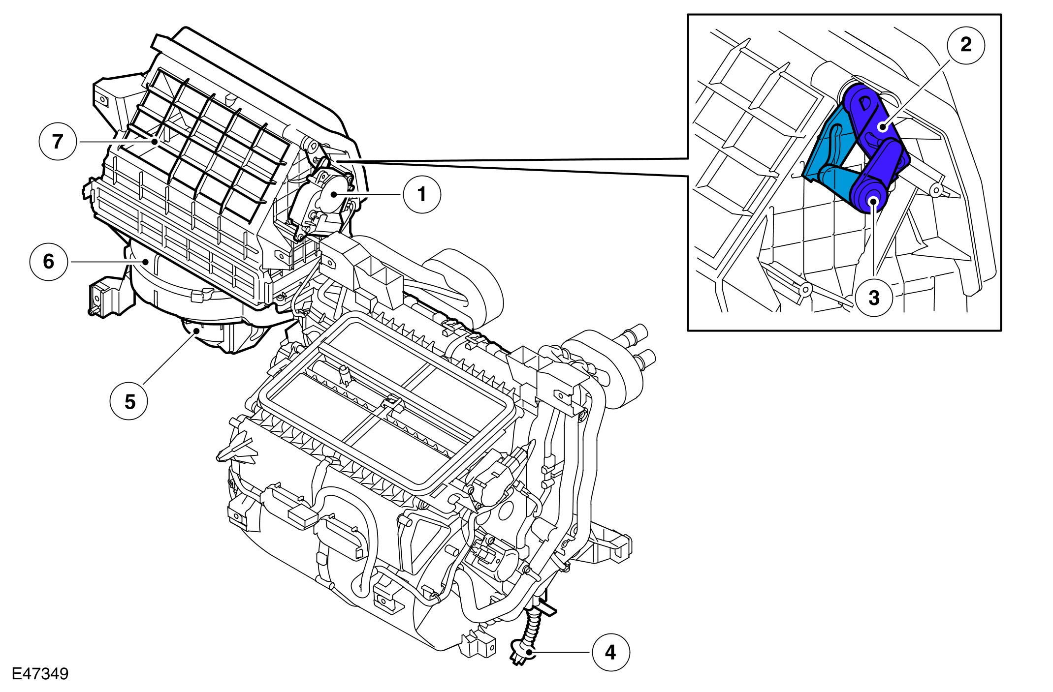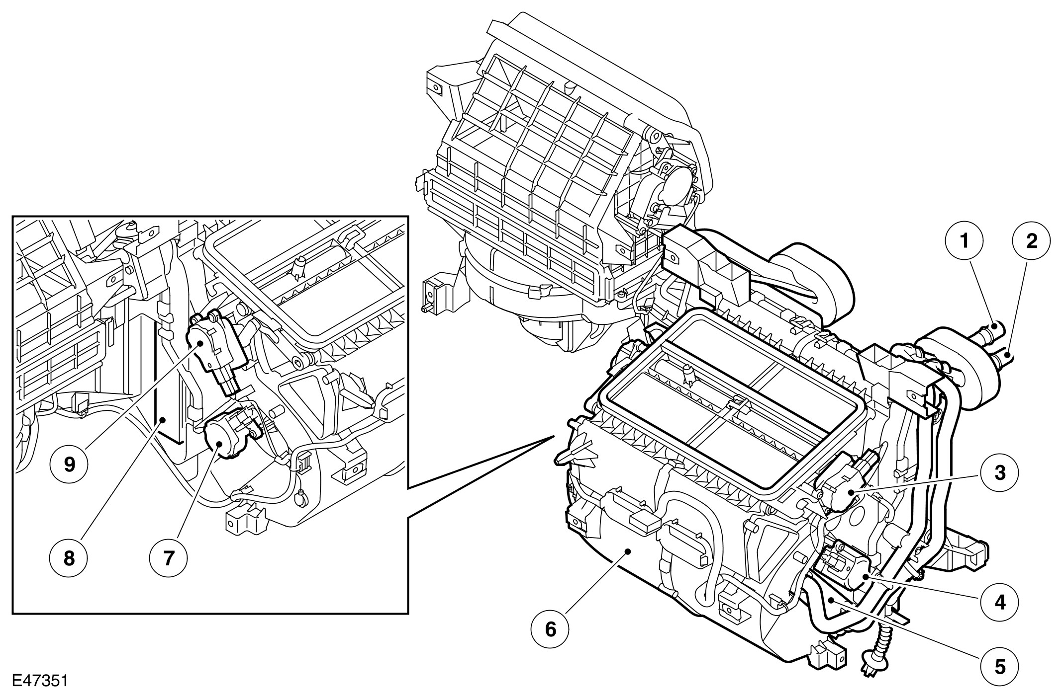 The heater controls the temperature of the air supplied to the distribution ducts, as directed by the ATC (automatic temperature control) module. The heater is installed on the vehicle center-line, between the instrument panel and the engine bulkhead. The heater consists of a casing, formed from plastic moldings, which contains an evaporator, heater core and control doors. Internal passages integrated into the casing guide the air through the casing and separate it into two flows, one for the LH (left-hand) outlets and one for the RH (right-hand) outlets.