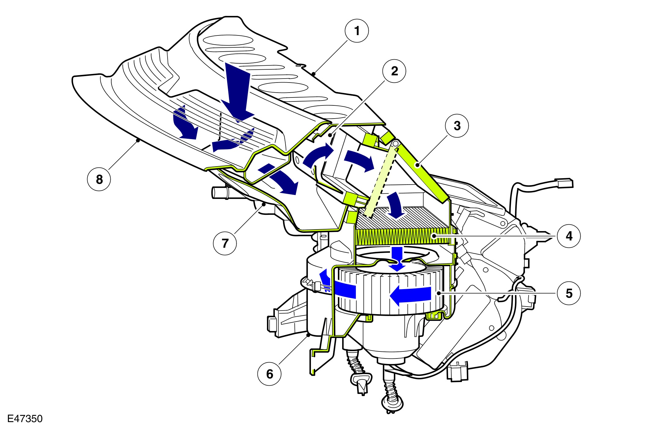 Fresh or recirculated air enters the air inlet duct and passes through the cabin air filter to the hub of the blower. From the blower, the air flows to the outlet of the air inlet duct and into the heater. The blower, and ram effect from the forward motion of the vehicle, forces the air through the air inlet duct.