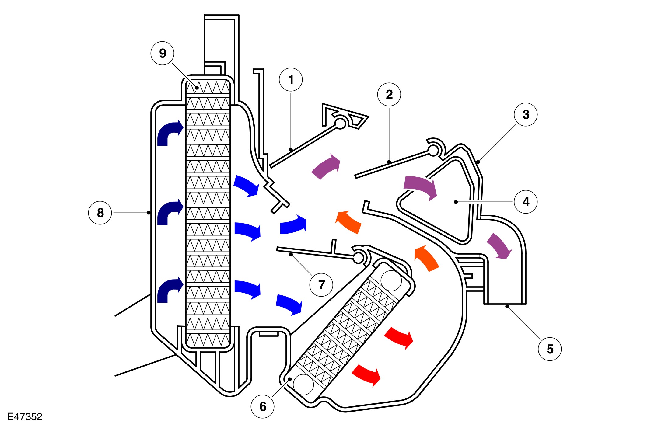 Fresh or recirculated air flows into the heater assembly from the inlet duct. The blower, and ram effect when the vehicle is moving, forces the air through the heater assembly. Air from the cabin exhausts through the ventilation outlets.