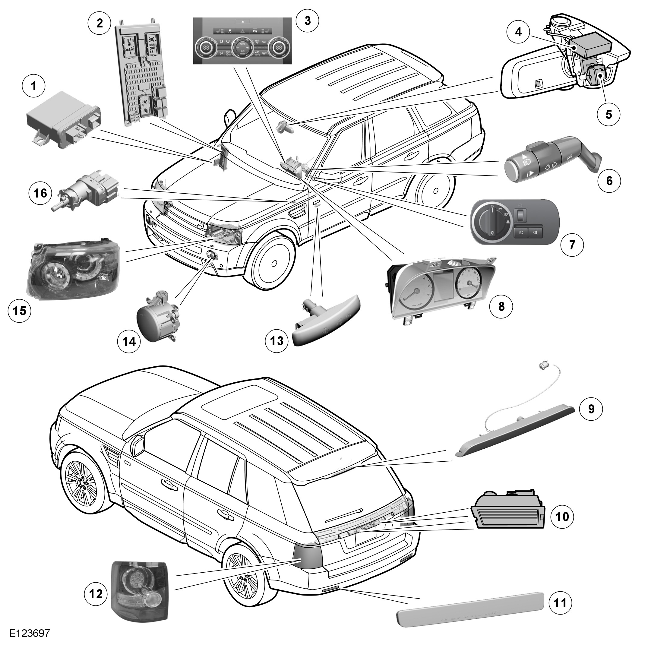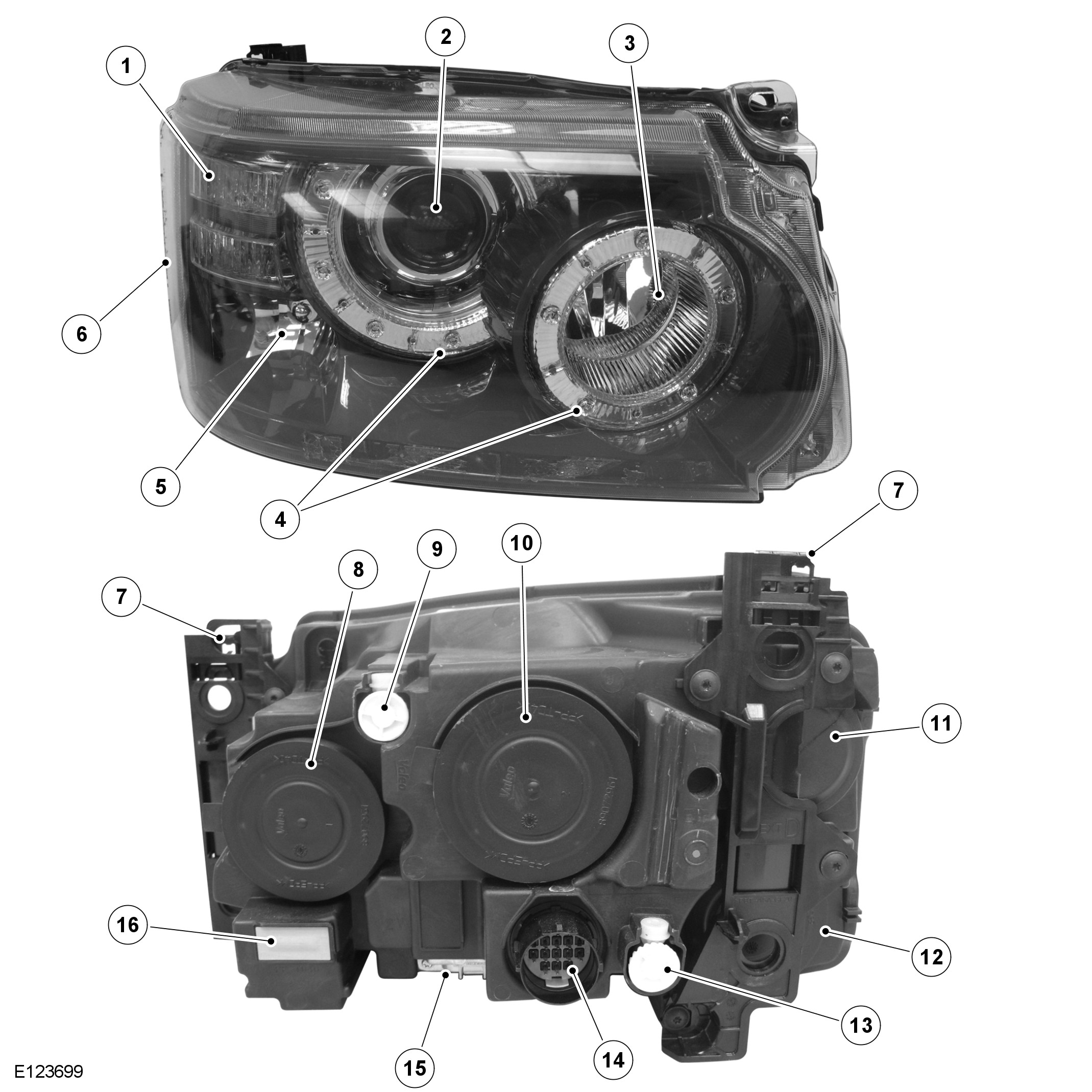 Each headlamp has an integral sixteen pin connector which provides inputs and outputs for the various functions of the headlamp assembly. The usage of the pins differs between model variants, refer to the Electrical Reference Library (ERL) for pin details.