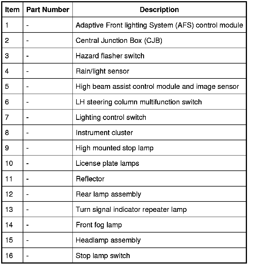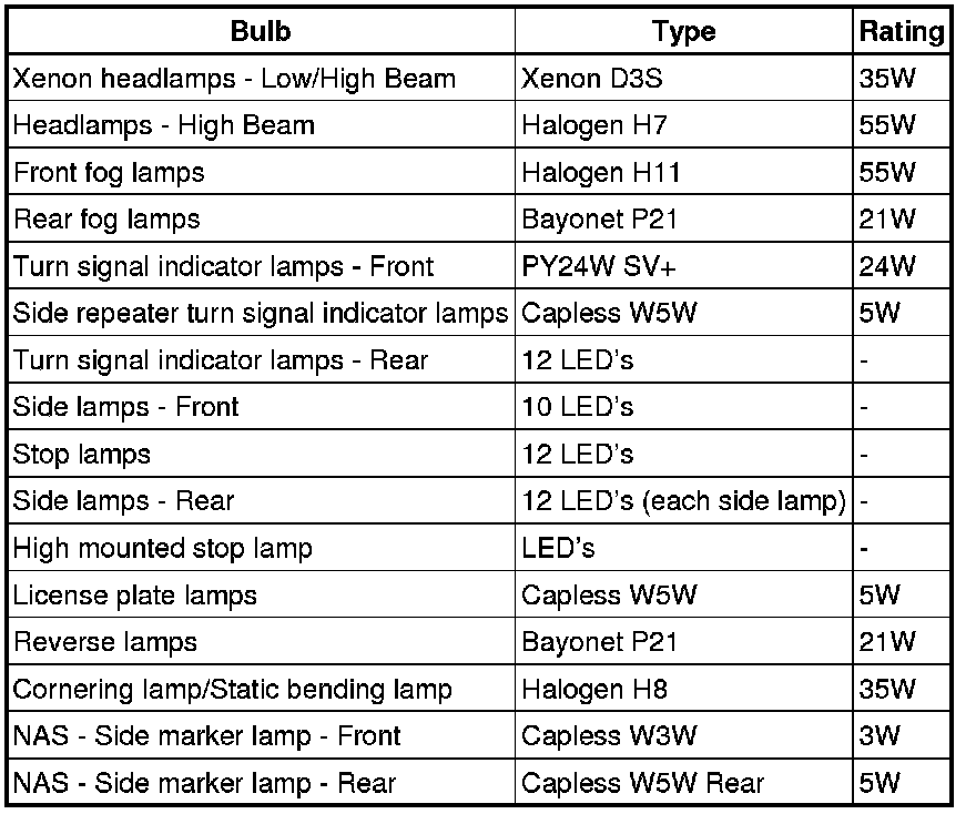 The following table shows the bulbs used for the exterior lighting system and their type and specification.
