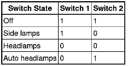 The lighting control switch uses a binary system which is detected by the CJB which determines the selected position. The output from the lighting control switch is shown in the following table: