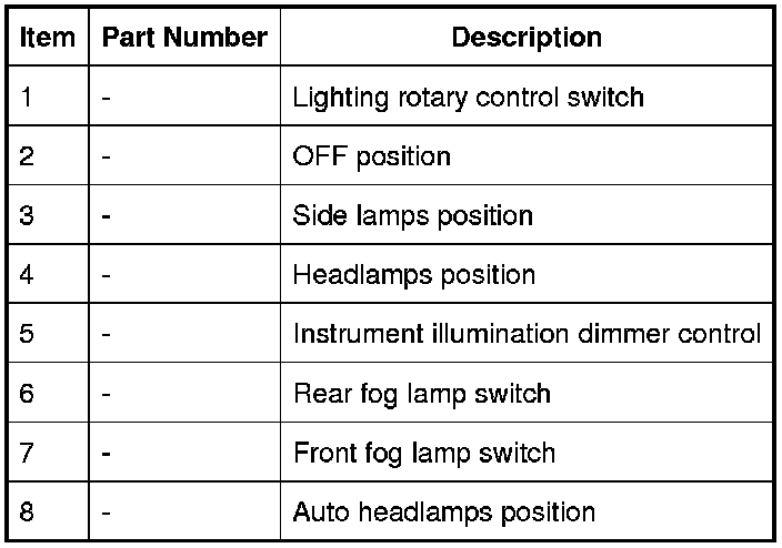 The lighting control switch is located in the driver's side of the instrument panel, below the outer fresh air vent. The switch contains a rotary switch for selecting the vehicle exterior lighting functions, a rheostat for instrument illumination dimmer, a front fog lamp switch and a rear fog lamp switch.