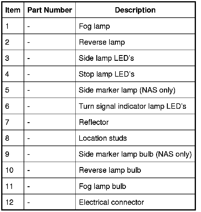The rear lamp assembly is a one piece unit which contains a stop lamp, a rear side lamp, a turn signal indicator lamp, a second rear side lamp, a reversing lamp and a fog lamp. Light Emitting Diode (LED)'s are used for the tail lamp, stop lamp and turn signal indicator lamp. Reversing lamp and fog lamp use bayonet fitting bulbs. These are located in holders which fit into the applicable hole in the lamp housing and are locked by rotating. Each bulb holder is connected by wires to a connector on the rear of the lamp housing.