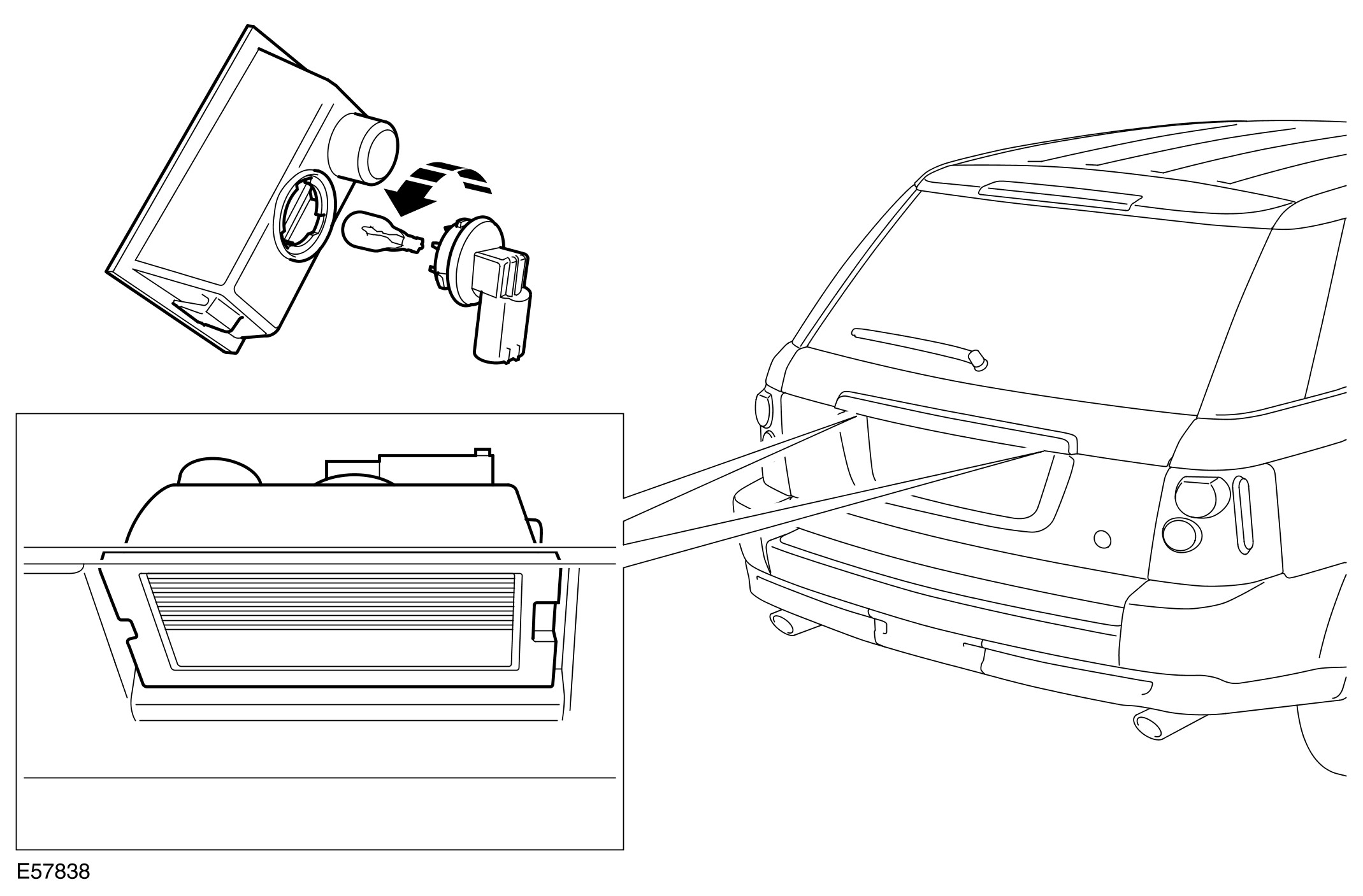Two license plate lamps are fitted in the tailgate handle, above the license plate in the upper tailgate. Each lamp uses a 5W capless type bulb. The lamps are secured in the upper tail gate handle with integral clips. The lamps can be released from the handle using a small, flat blade screwdriver.
