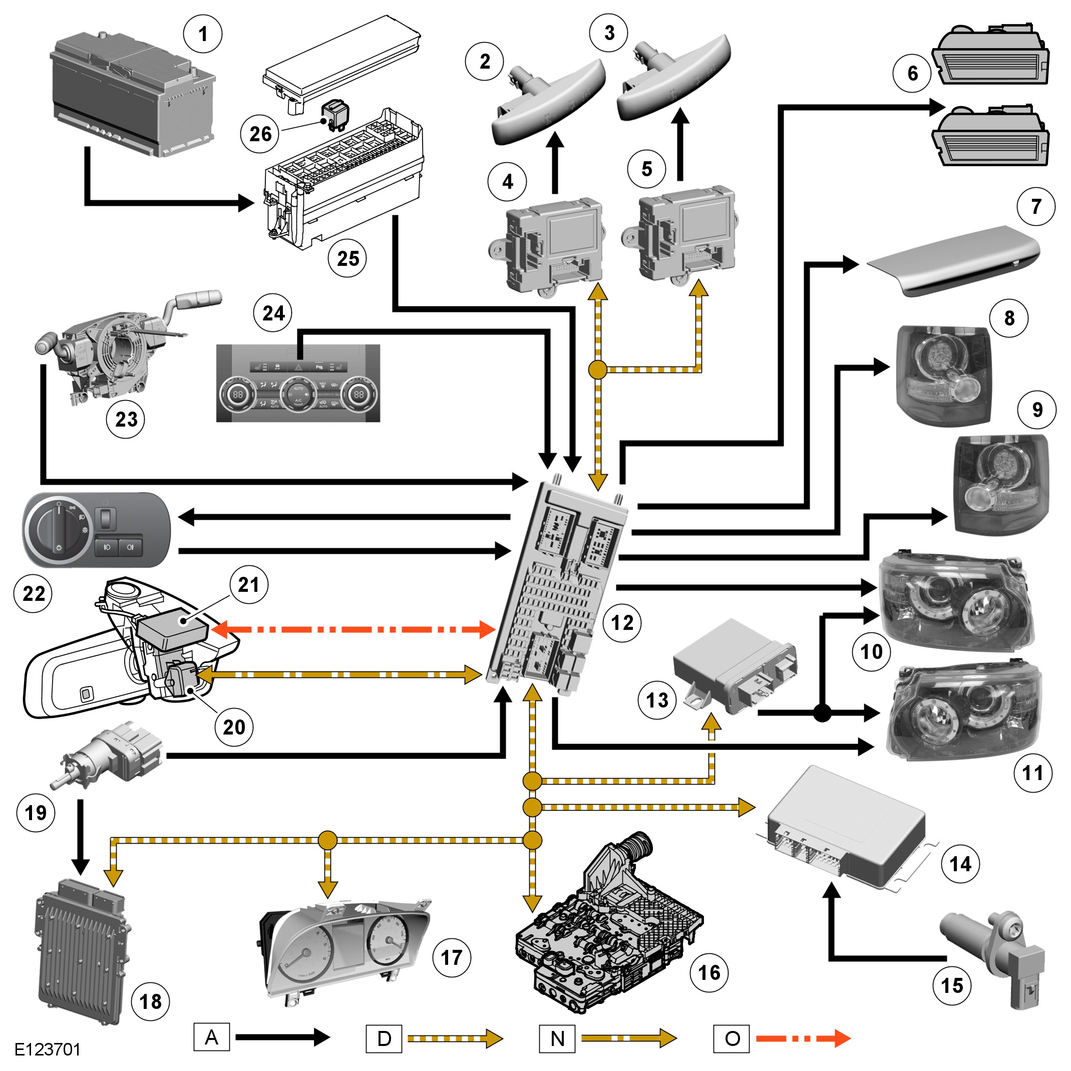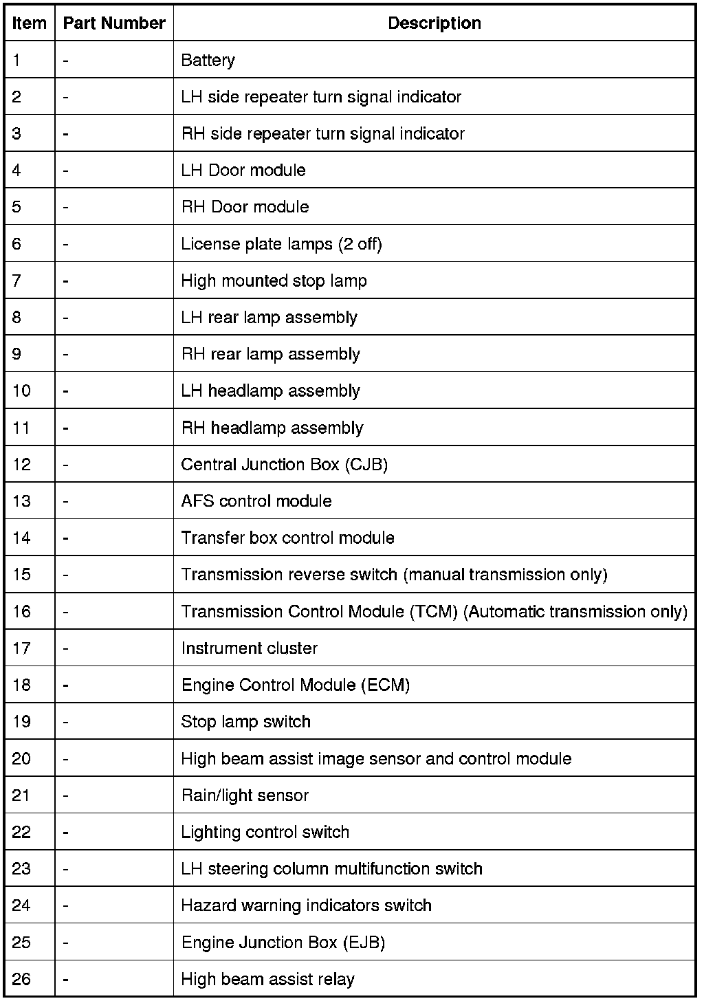 The CJB monitors the status of the lighting circuits, relays and switches. If a fault occurs, the CJB stores a fault code applicable to the specific fault which can be retrieved using an approved Land Rover diagnostic system or other suitable scan tool.