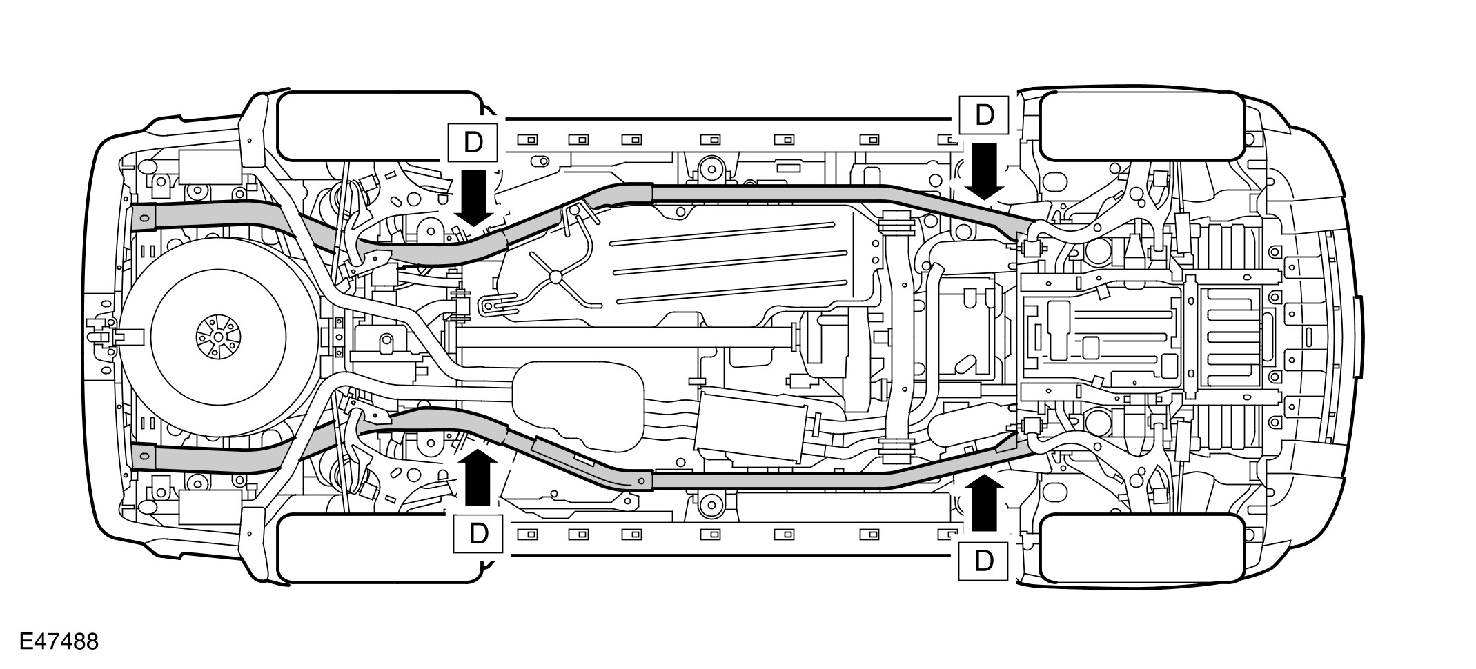 With vehicle at desired height, position axle stand(s) beneath longitudinal members and adjacent to the lifting pad of the jack at appropriate point(s) D.