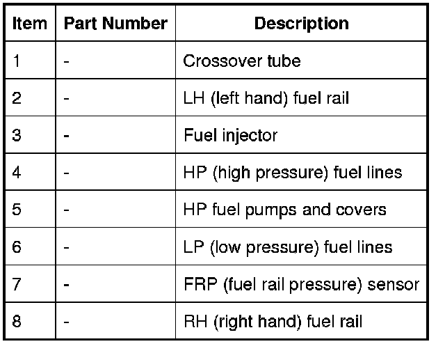 LP fuel from the pump in the fuel tank is pressurized by the HP fuel pumps and supplied to the fuel injectors via the fuel rails and crossover tube. The ECM (engine control module) controls the fuel injectors and HP fuel pumps to inject the required volume of fuel into the combustion chambers.