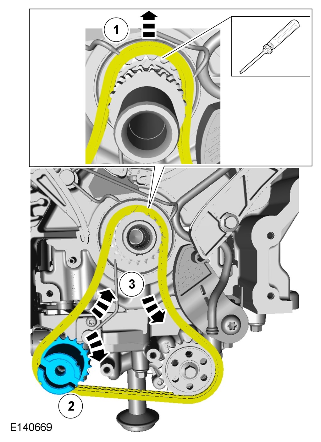 CAUTION: Inspect the 3 timing chain oil nozzles for signs of damage, install as necessary.