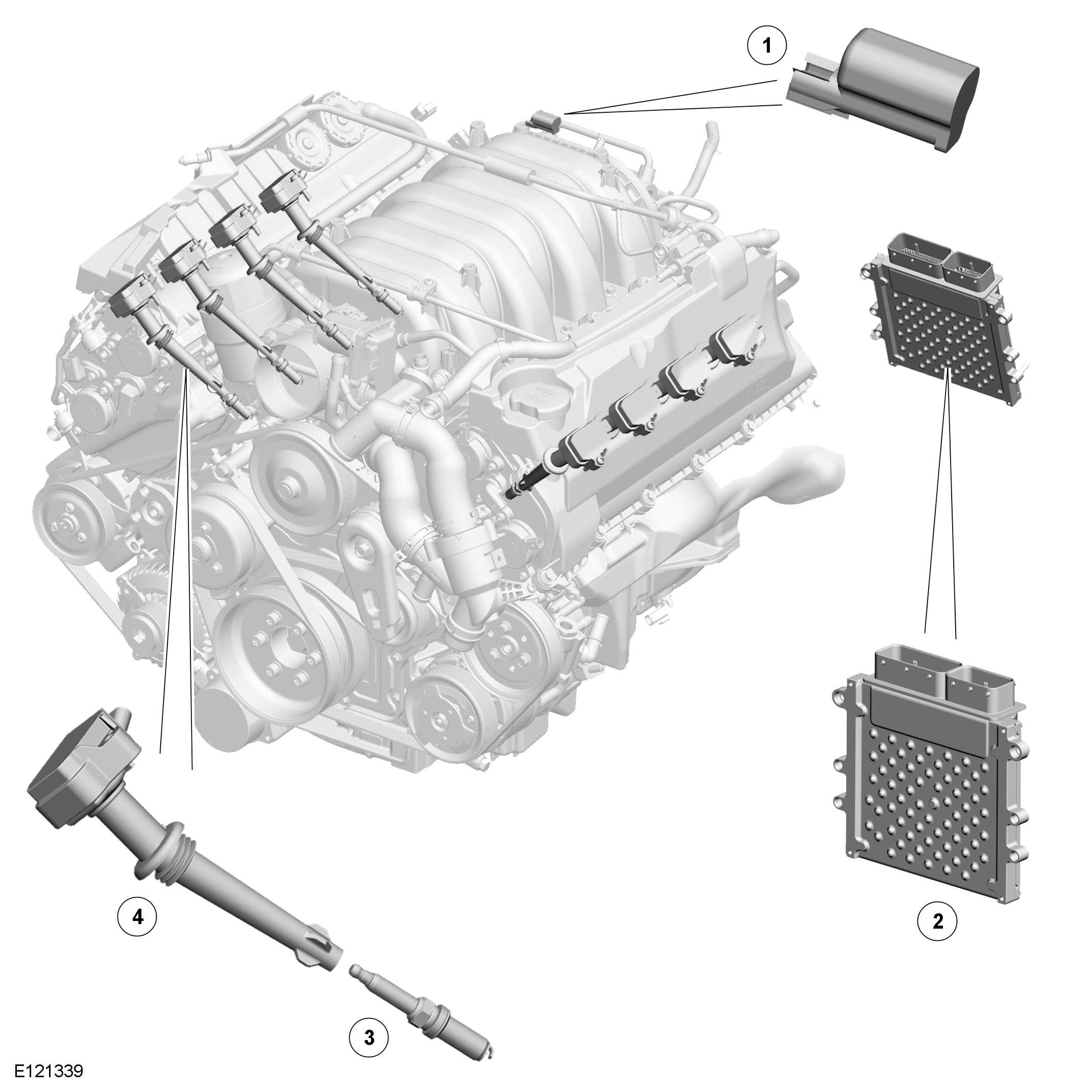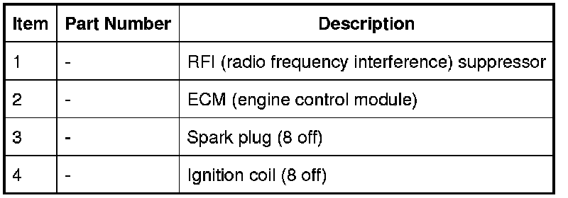 The engine ignition system is a coil-on-plug, single spark system controlled by the ECM (engine control module). An iridium tipped spark plug is installed in each combustion chamber, between the inlet and exhaust valves, and an ignition coil is installed on each spark plug. A RFI (radio frequency interference) suppressor is connected to the power feed to the ignition coils.