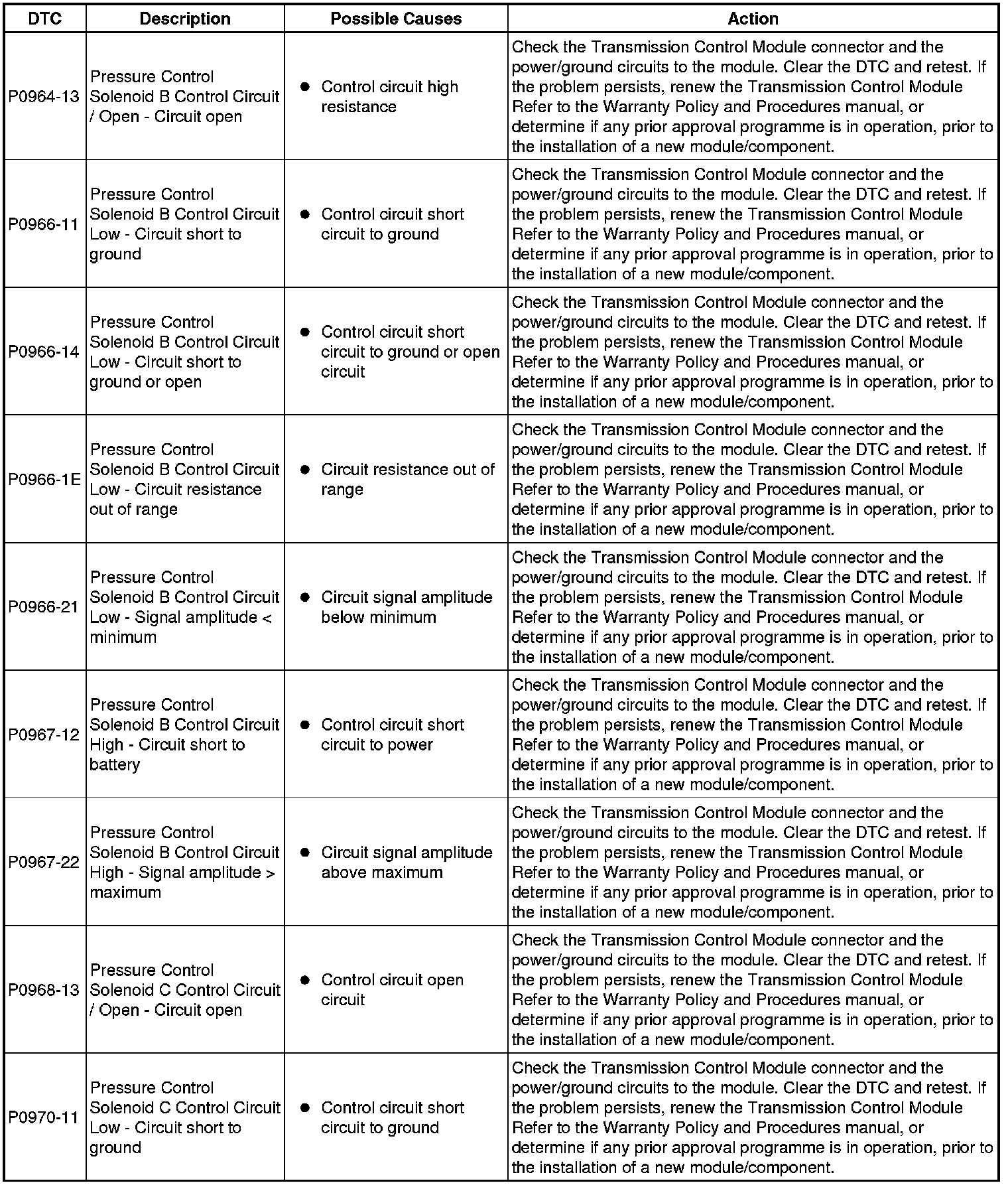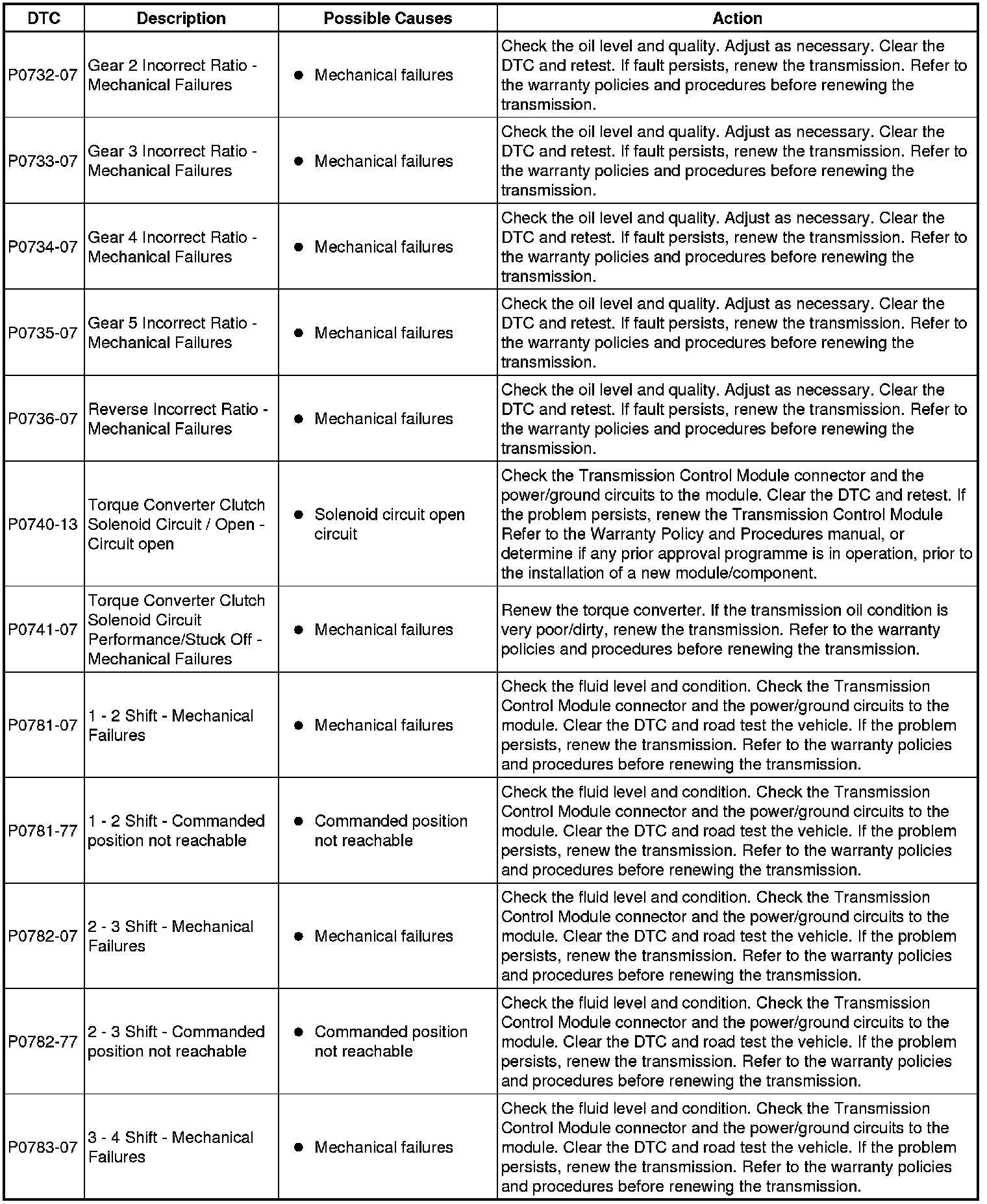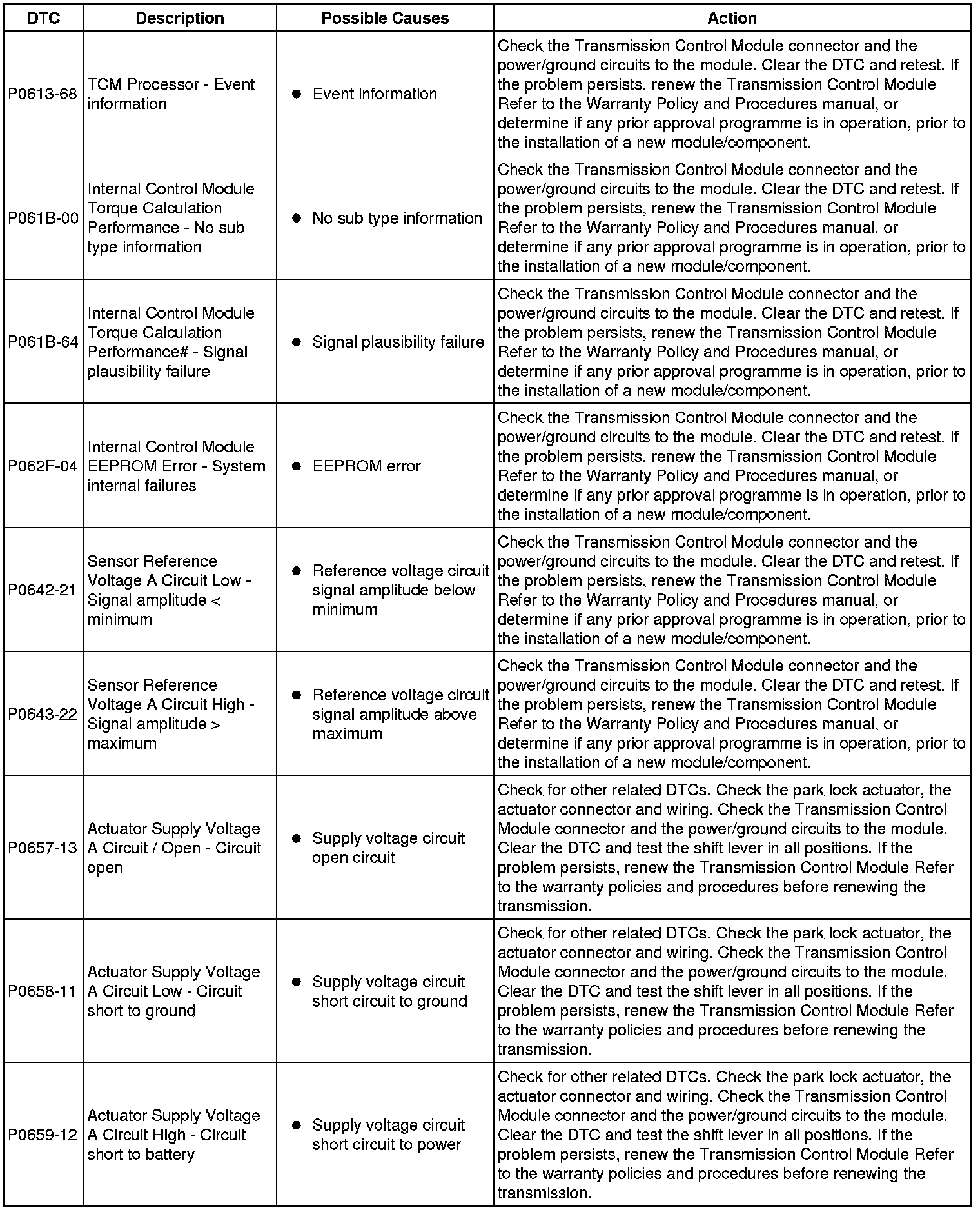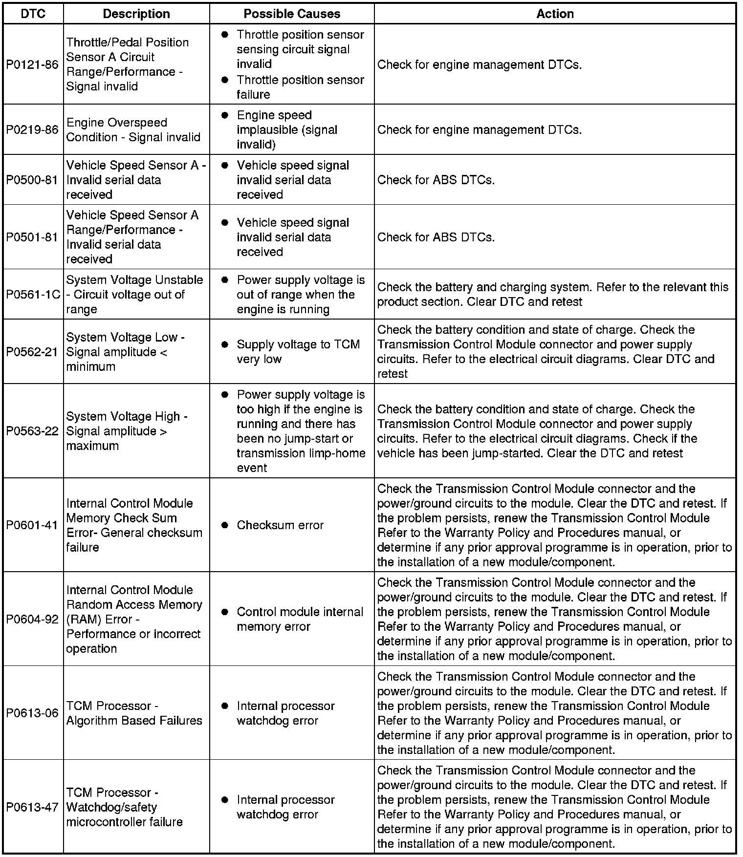 The table below lists all Diagnostic Trouble Codes (DTCs) that could be logged in the Transmission Control Module, for additional Diagnosis and Testing information refer to the relevant Diagnosis and Testing Section. For additional information, refer to Diagnostics Testing and Inspection
