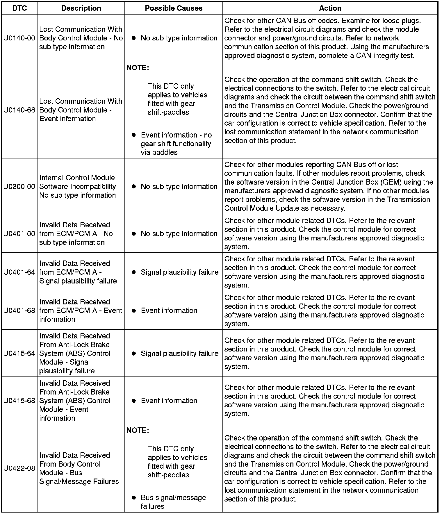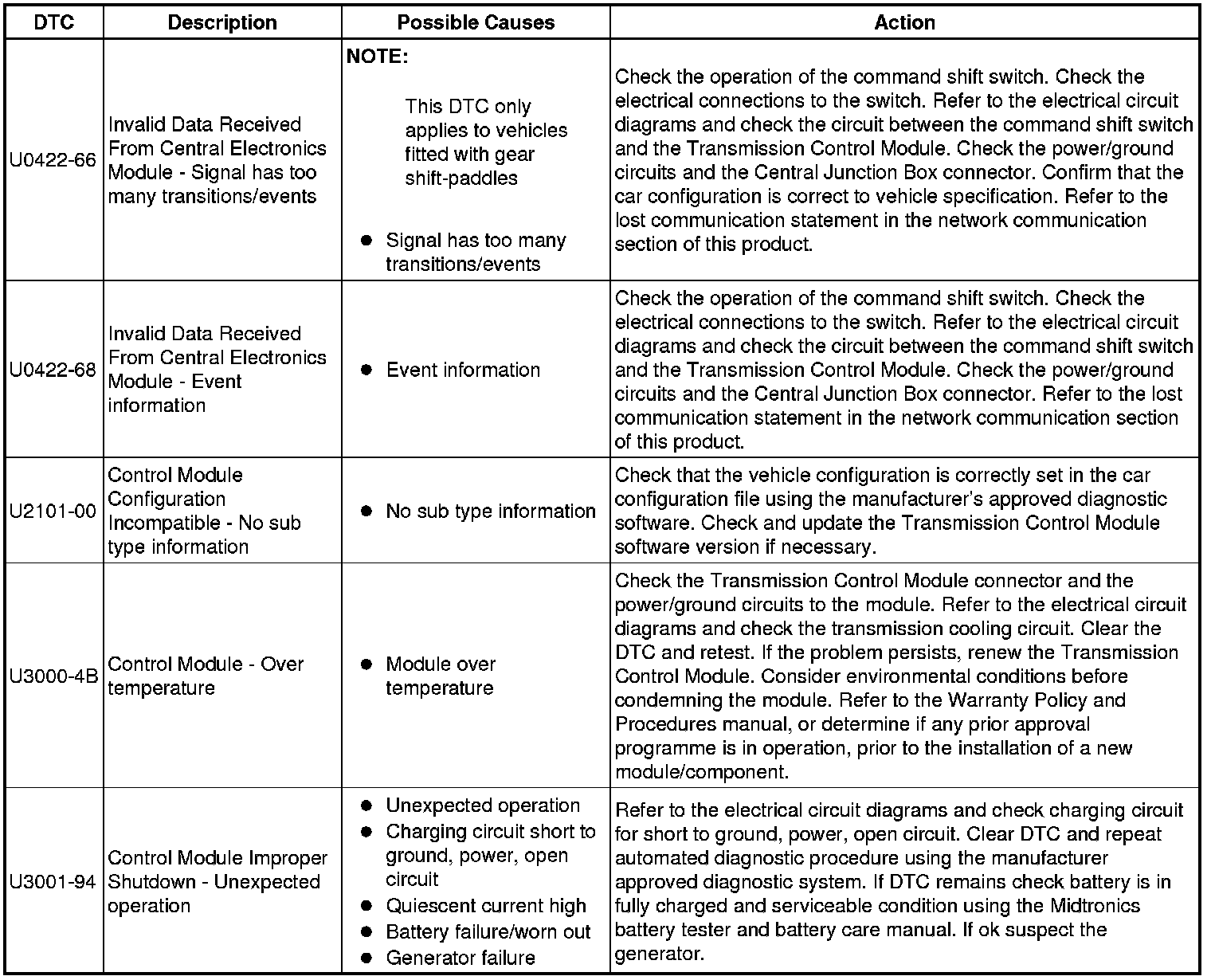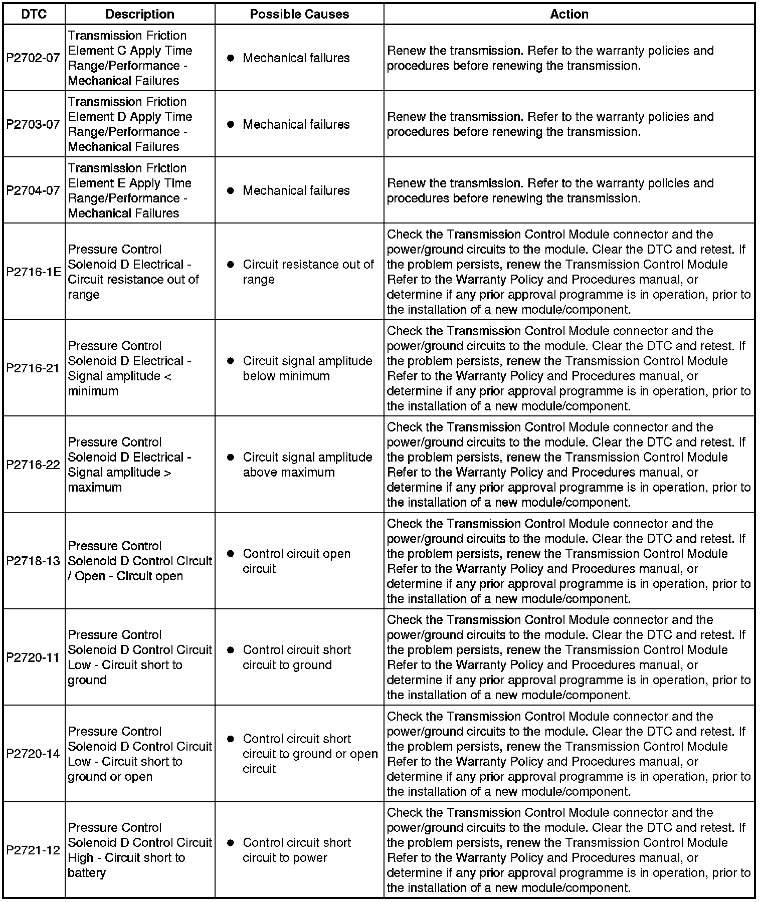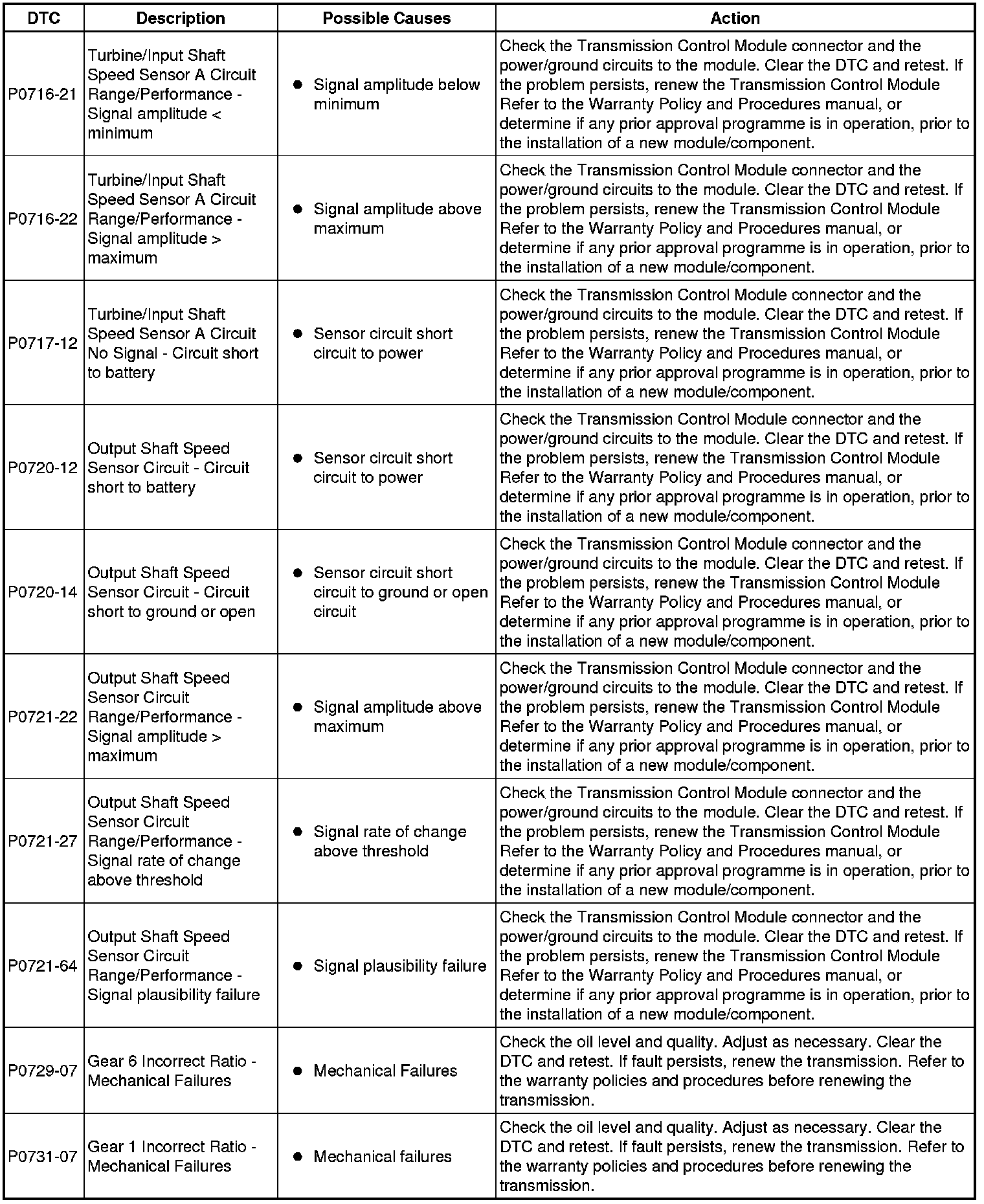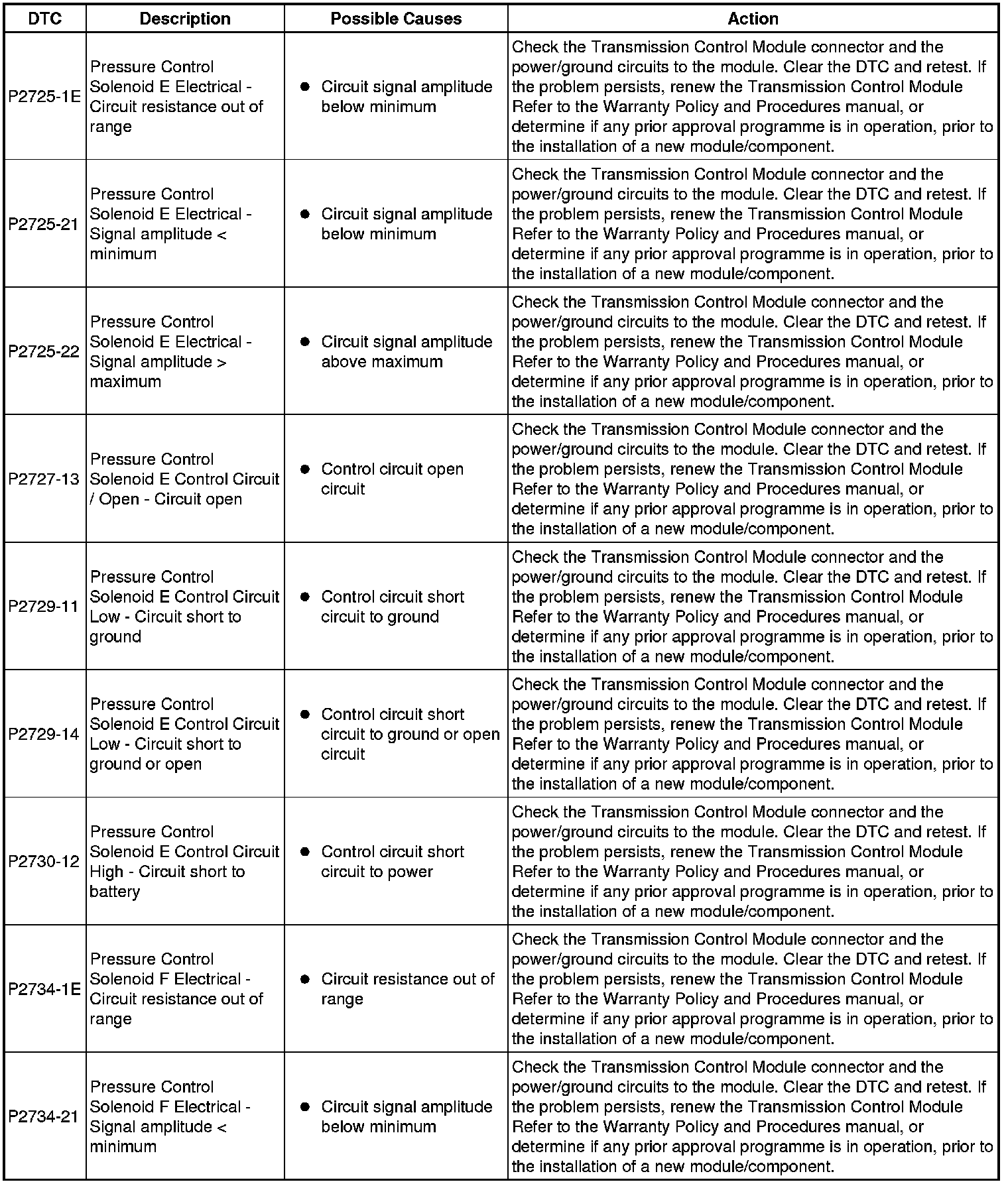 The table below lists all Diagnostic Trouble Codes (DTCs) that could be logged in the Transmission Control Module, for additional Diagnosis and Testing information refer to the relevant Diagnosis and Testing Section. For additional information, refer to Diagnostics Testing and Inspection