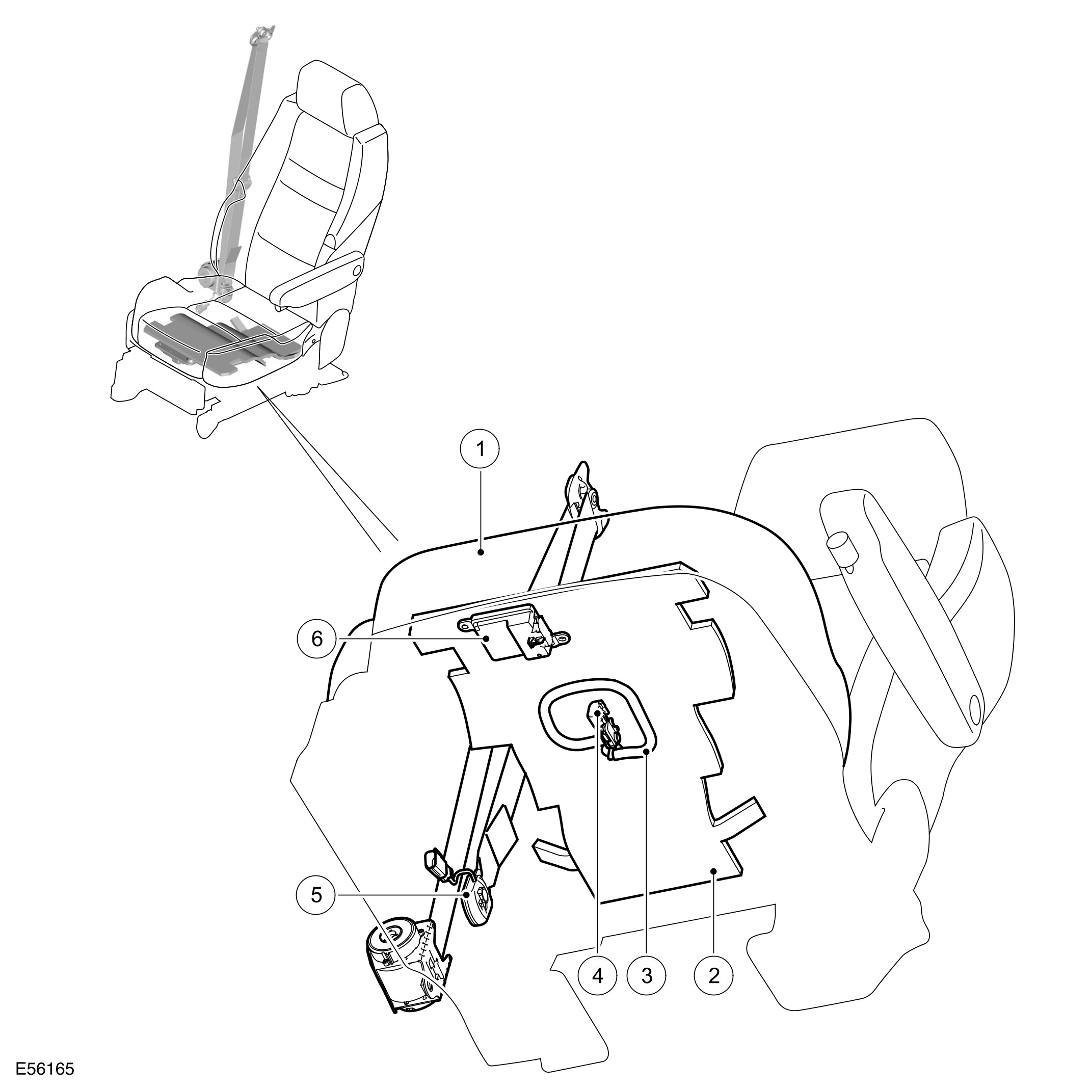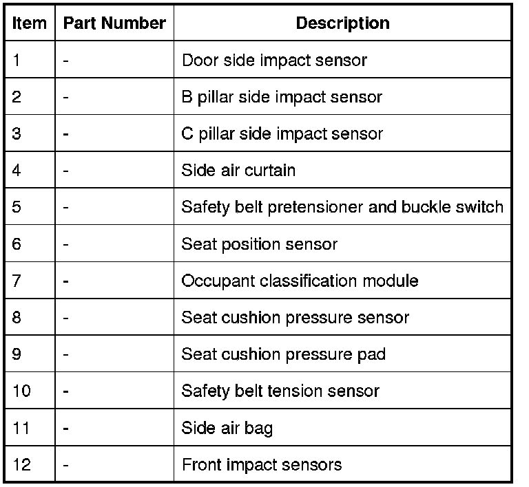 A side air bag is attached to the outside of each front seat backrest frame, under the backrest cover. In all markets except NAS, the side air bags each consist of a single section, which deploys to protect the thorax region. In NAS markets, the side air bags each consist of two sections, inflated using a common inflator, which deploy to protect both the thorax and the pelvic regions.