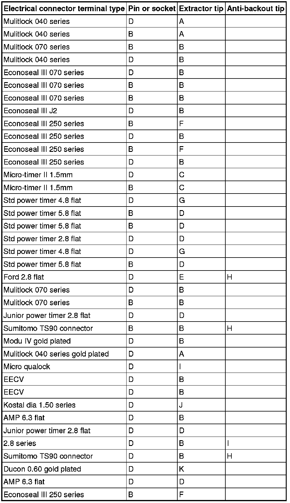 The chart shows the electrical connector types, terminal pins/sockets, extractor tip and anti-backout tip.