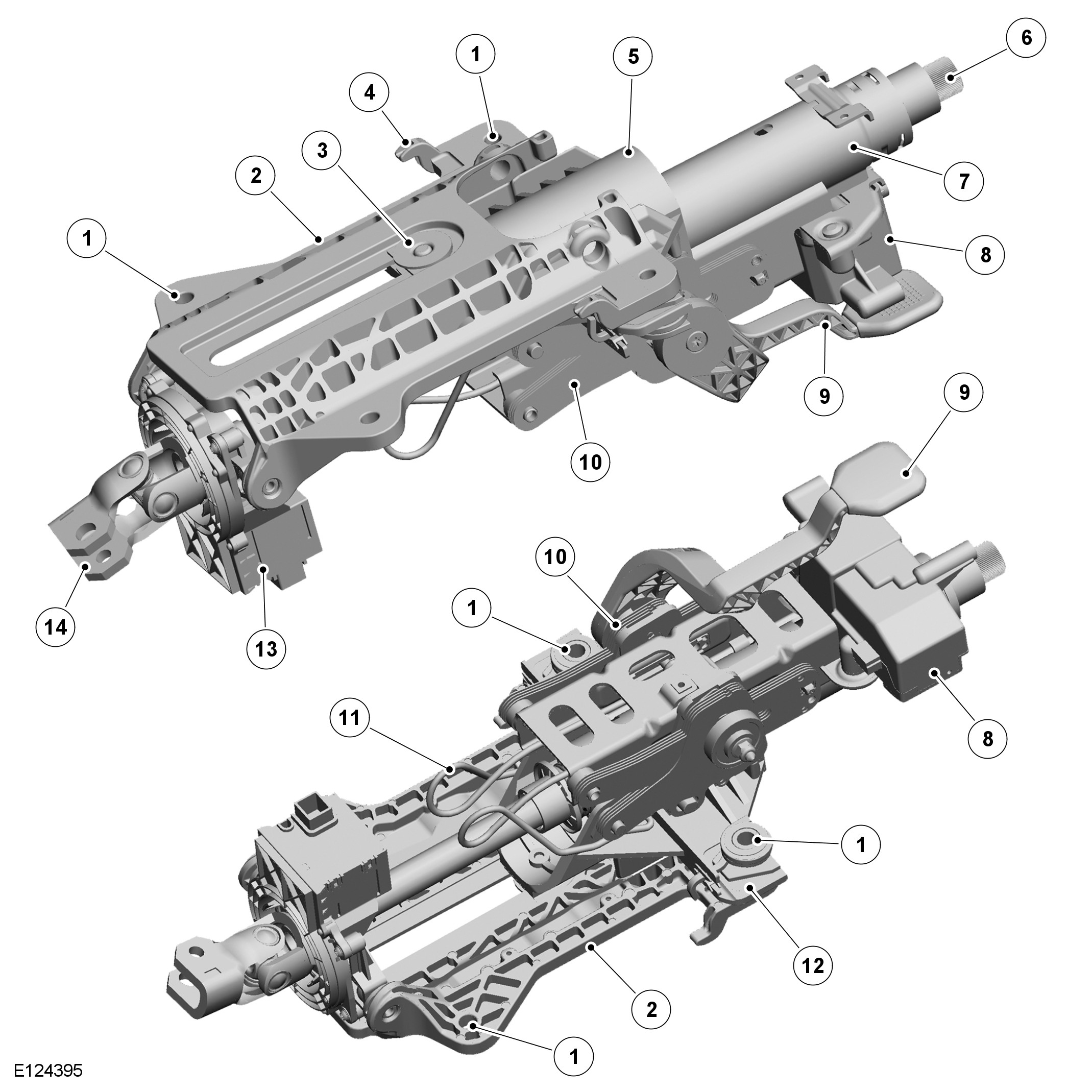 The upper steering column assembly is electronically adjustable for steering wheel reach and rake and is controlled by the CJB (central junction box). The upper steering column assembly also provides the location for the electronic steering lock mechanism and the steering angle sensor.