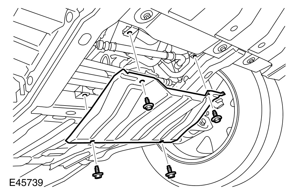 5 Remove the front LH fender splash shield.For additional information, refer to Fender Splash Shield Fender Splash Shield