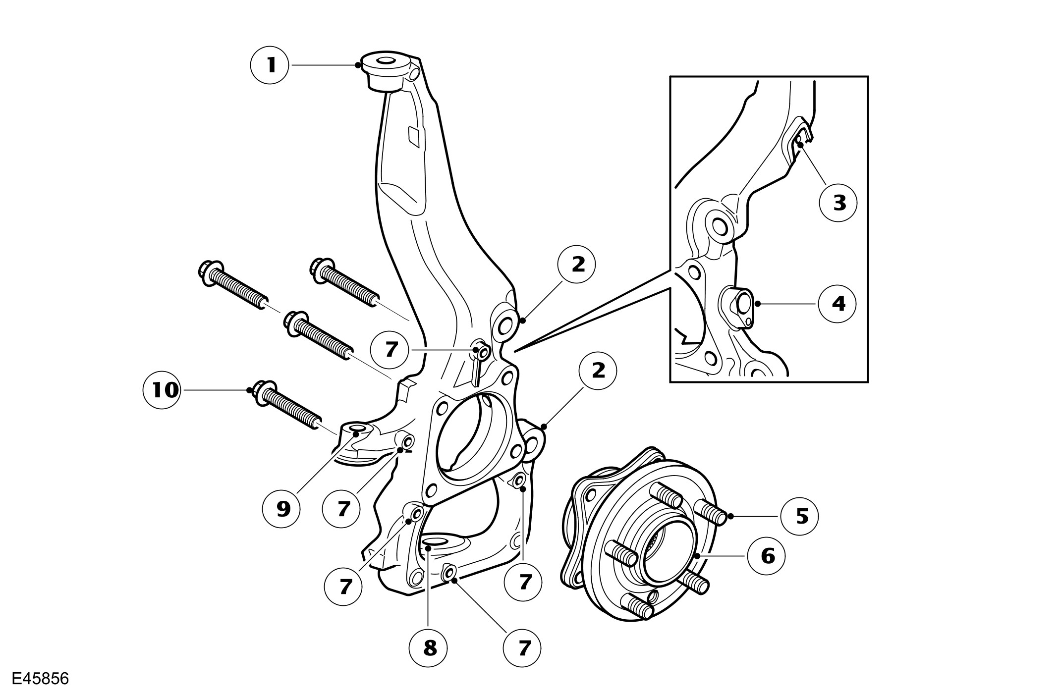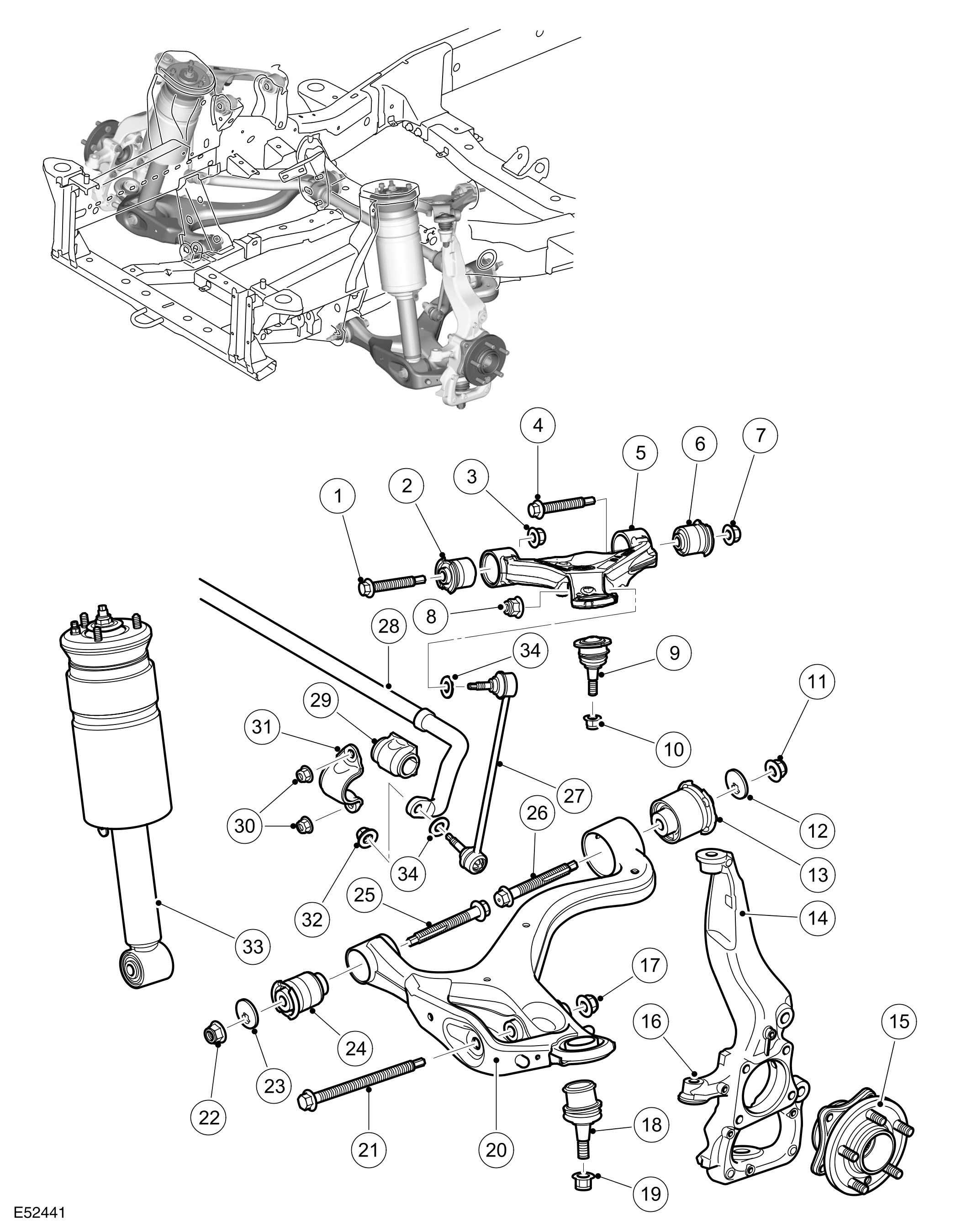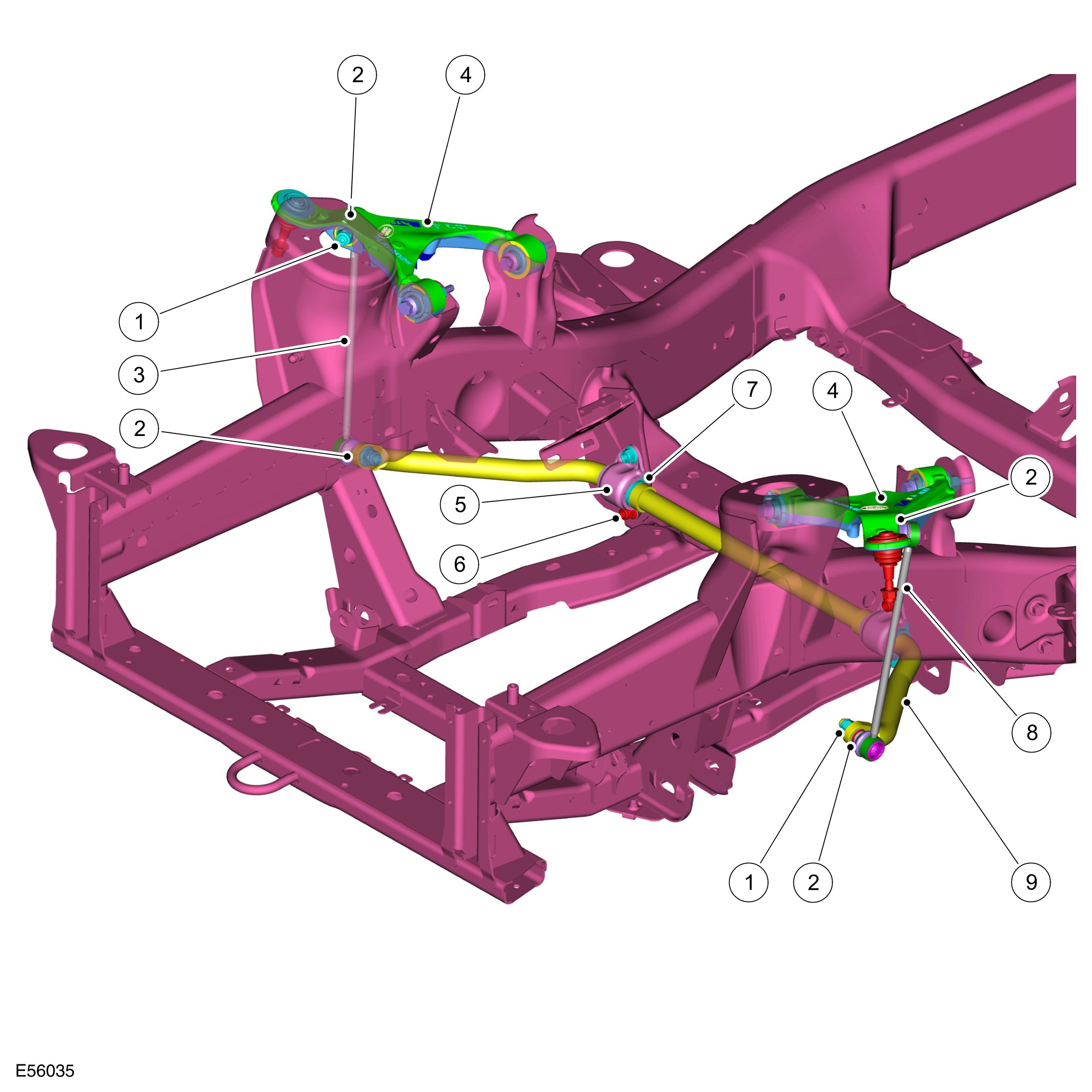 The front suspension is a fully independent design which offers a reduction in unsprung weight over the beam axle design. The front suspension comprises an upper arm, a lower arm, a wheel knuckle and hub, a stabilizer bar and links assembly and an air damper assembly. A conventional stabilizer bar is fitted to some models, with a Dynamic Response stabilizer bar system available as a standard or optional fitment. For additional information, refer to Active Stabilization System