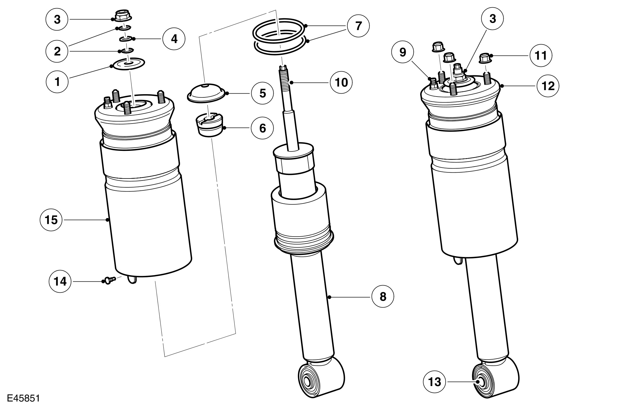 The damper assembly is a mono tube design with an air spring. The lower end of the damper is fitted with a bush and is attached to the lower arm with a bolt and nut.
