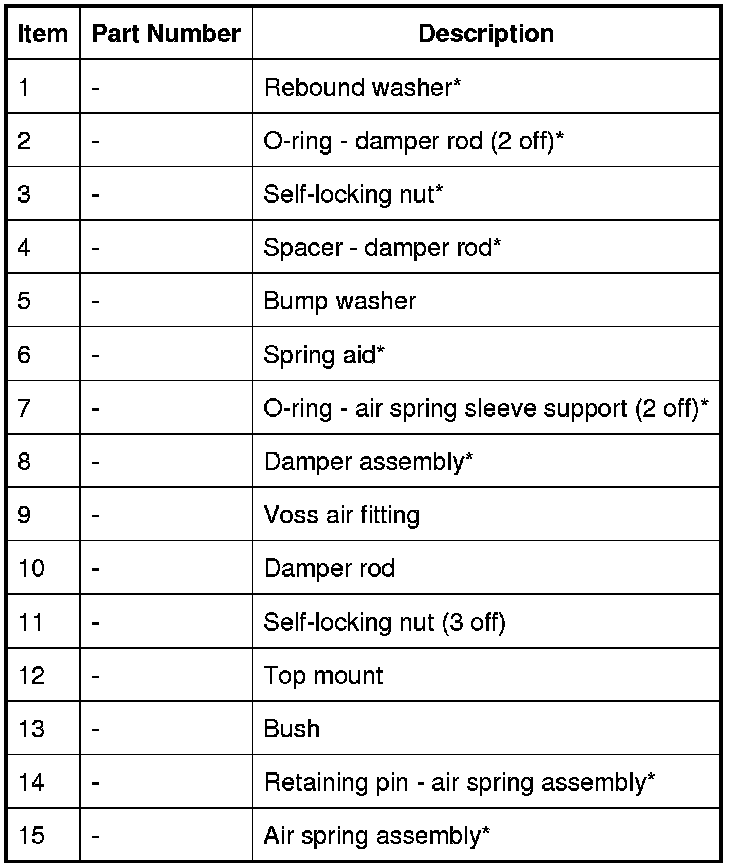 The top mount is an integral part of the air spring and is fitted with a bush and a rebound washer. A bump washer is located between the top mount plate and the damper rod. The top mount is secured to the damper rod with a self-locking nut. The top mount attaches to a housing on the chassis with three integral studs and self-locking nuts. The top mount also incorporates a 6 mm Voss air fitting which allows for the attachment of the air harness.