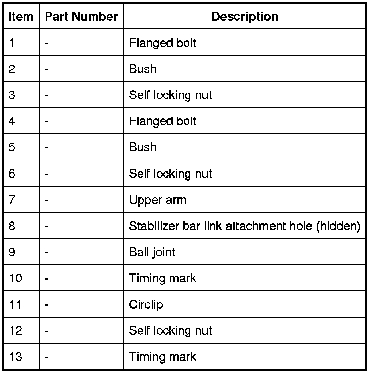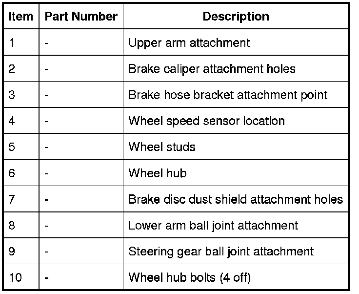The ball joint is pressed into the upper arm. The ball joint is an interference fit in the hole which prevents the ball joint from moving. A circlip is fitted to the ball joint to retain it in the hole. The top face of the ball joint has two semi-circular cut-outs. One of these cut-outs must be aligned with the small indentation in the upper arm to ensure the correct operation of the ball joint.