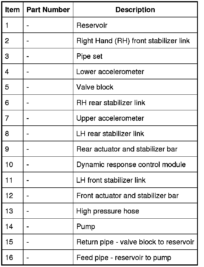The Dynamic Response system uses two accelerometers to detect vehicle cornering forces and inputs from the steering angle sensor to supply data to a dynamic response control module. The control module then operates solenoid valves in a valve block which apply hydraulic pressure to actuators fitted to the front and rear stabilizer bars. The application of hydraulic pressure to the actuators applies a specified amount of torque to the stabilizer bars to counteract the cornering forces and minimize vehicle body roll.