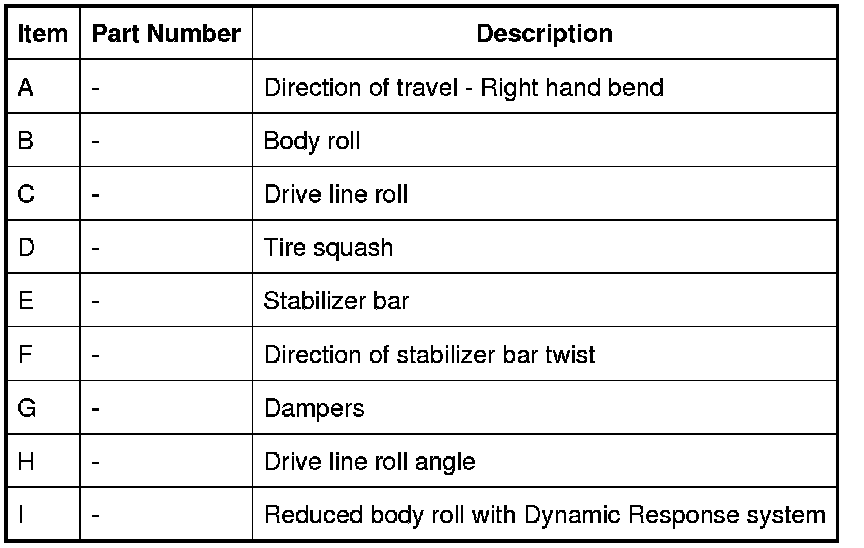 The following illustrations demonstrate the difference in body angle between a conventional 'passive' (non-Dynamic Response) stabilizer bar vehicle and a vehicle fitted with the Dynamic Response system.