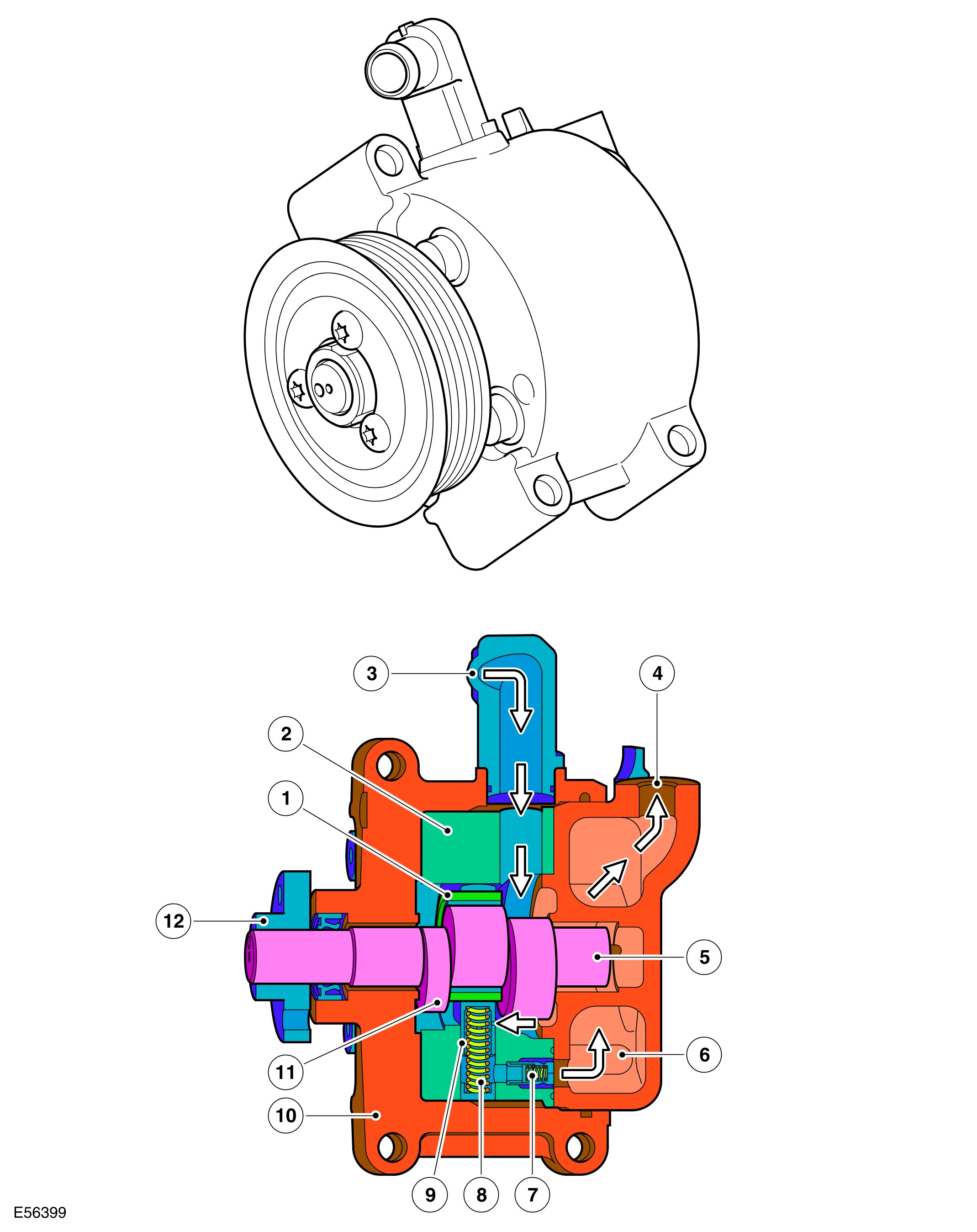 The radial pump has eight pistons located in bores in a cylinder housing. A balanced central shaft, which is driven by a pulley and the auxiliary drive belt, has a cam which operates the pistons as the shaft rotates.