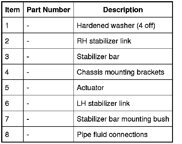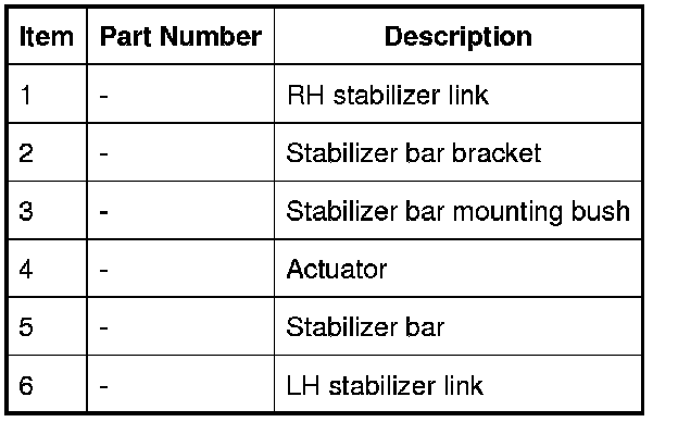 The actuator assembly and the stabilizer bars are not serviceable items. Only the stabilizer bar attachment bushes, brackets and stabilizer links are serviceable components.