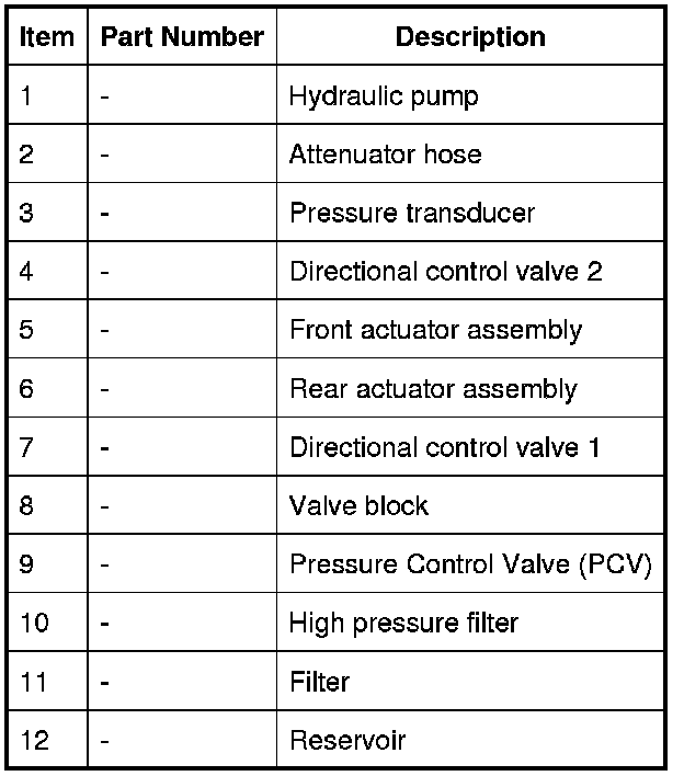 The flexible high pressure hose which supplies pressure from the pump to the high pressure pipe is fitted with attenuators. The attenuators comprise of tuned lengths of PTFE pipe and restrictors within the flexible hose. The attenuators damp pressure pulsations in the hydraulic fluid produced by the pump, reducing noise and strain on components downstream. The attenuator is integral with the high pressure hose and cannot be serviced separately.