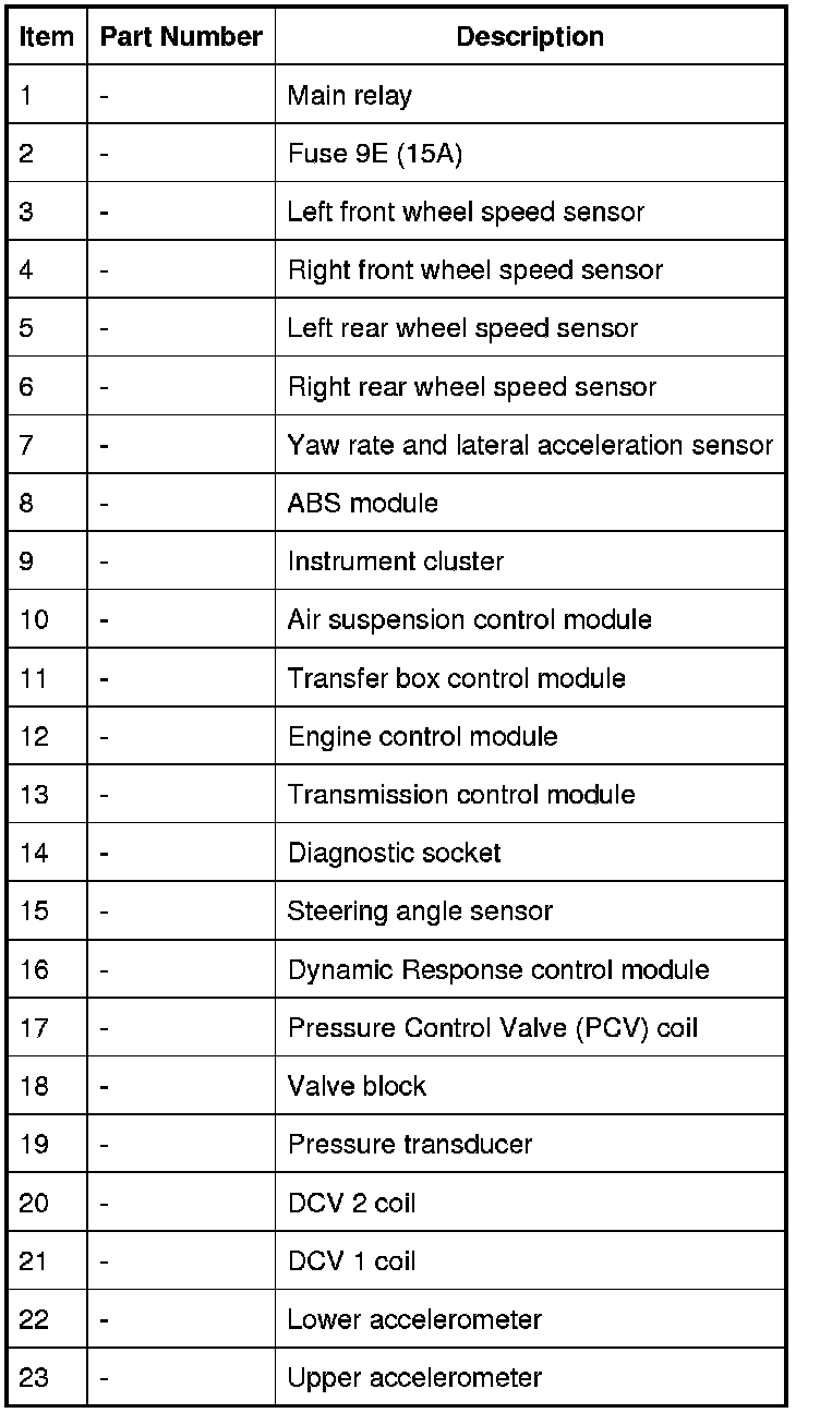 The Dynamic Response control module is connected on the high speed CAN bus to the diagnostic socket which allows diagnostic interrogation of the control module. The diagnostic socket allows for the connection of a Land Rover approved diagnostic system to read any stored fault codes in the control module. The control module can also be updated with revised software using a Land Rover approved diagnostic system should a software update be required.